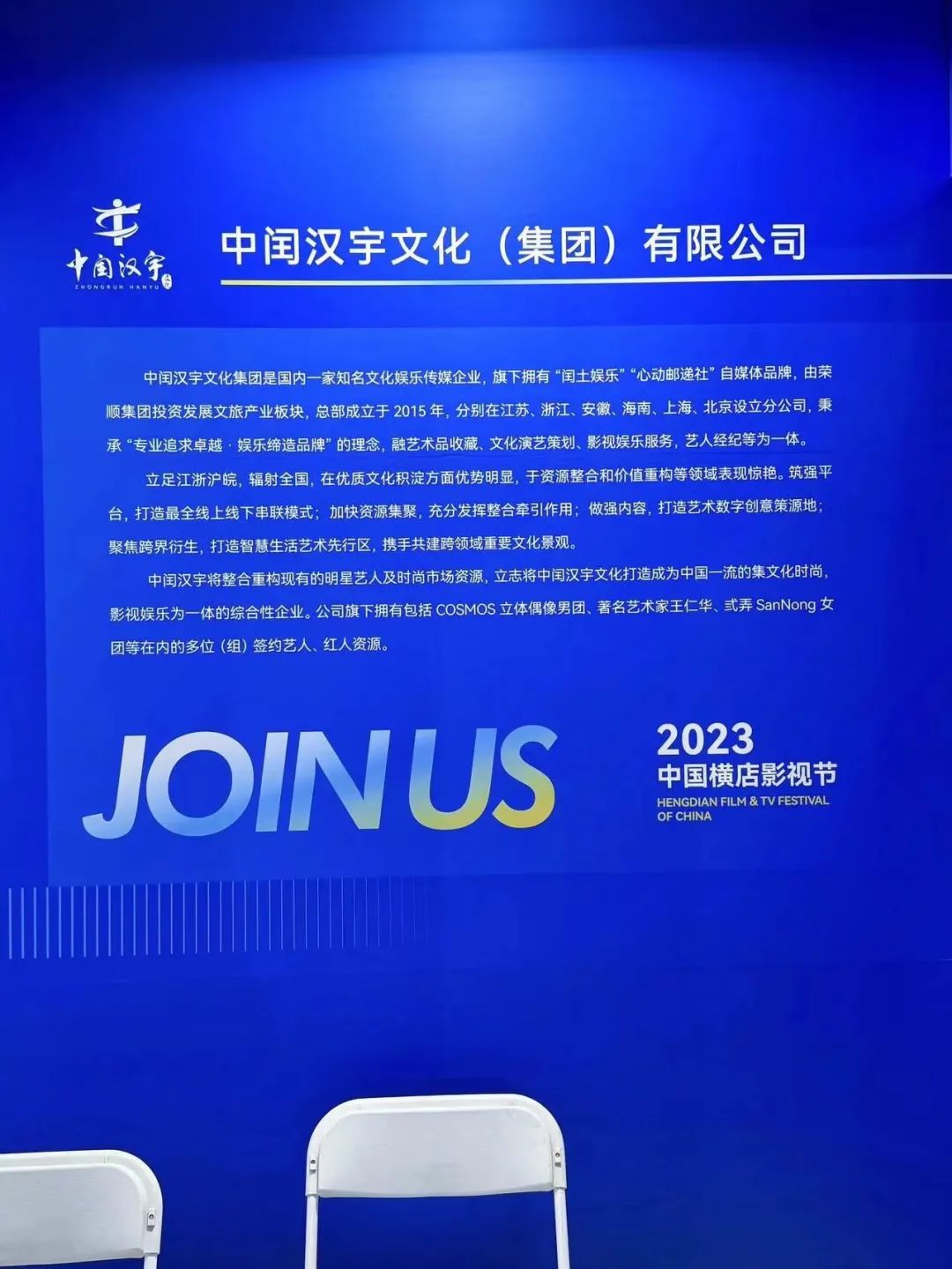 2023年10月27日,由中共浙江省委宣传部、省电影局、省广播电视局、金华市人民政府主办,金华市委宣传部、东阳市人民政府、横店影视文化产业集聚区管委会、横店集团承办的“传承文化 智影未来”2023横店影视节暨影视文化产业博览会在横店影视城开幕,中闰汉宇文化集团总裁周正汉、副总裁叶莘、设计总监吴松受邀出席。