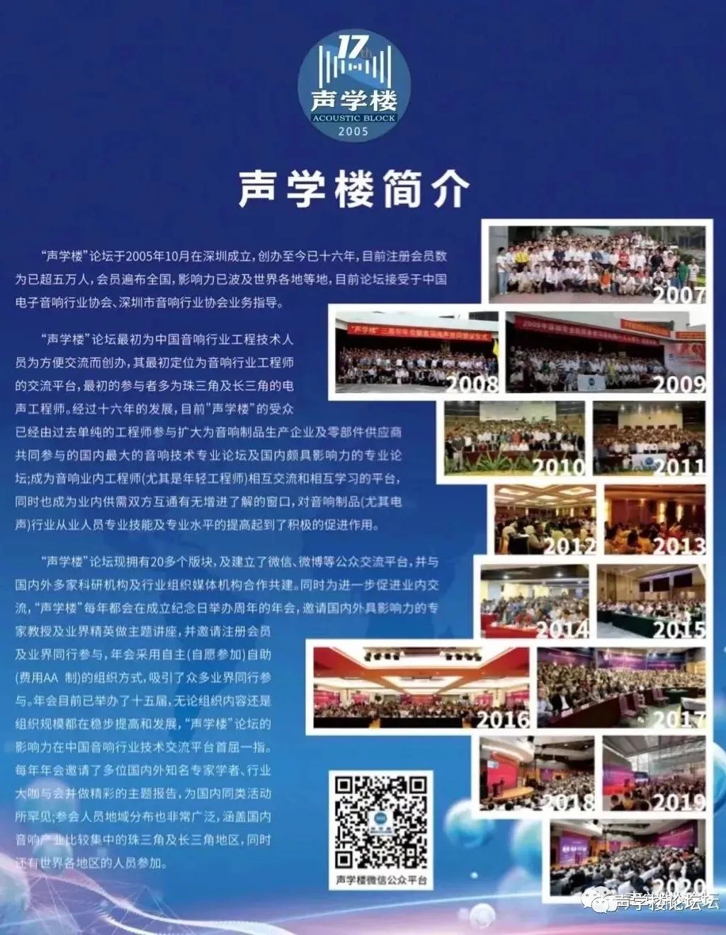声学楼论坛作为国内音频技术领域专业等级最高、历史最悠久、用户量最多、覆盖面最广、深受行业关注与高度认同的声学技术交流平台,长期以来,一直致力于展现全球声学领域的最新成果与应用,引领声学产业新的发展潮流,与中国音频产业共同成长十八年,影响深远。