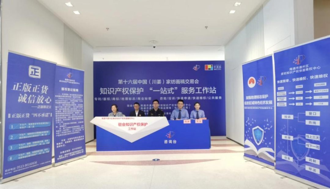 10月26日至30日,正值第十六届中国(川姜)家纺画稿交易会期间,南通市通州区家纺知识产权快速维权中心进驻交易会现场,开展知识产权“护航”活动,切实加强画稿交易会知识产权保护工作,维护交易会正常秩序,促进家纺产业健康发展。
