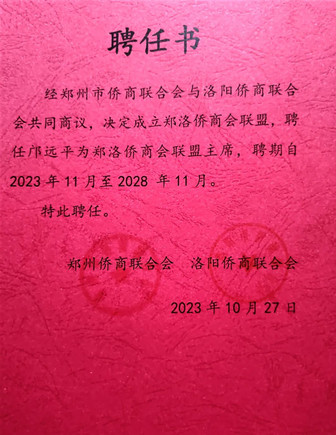 经过商议,邝远平担任郑洛侨商会合作联盟主席,李明献担任合作联盟执行主席,孙少波、党秀浩、宋军担任合作联盟副主席,雷双泉担任合作联盟秘书长、周佳担任合作联盟副秘书长。