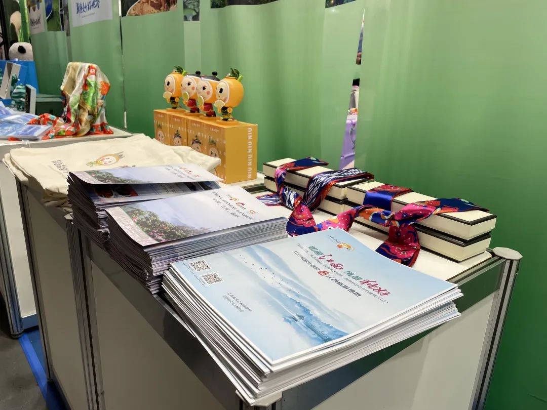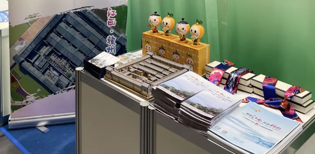 在中国馆的江西展台,赣州文旅携带了日文版宣传折页、多款赣州特色文旅产品参展,赣南脐橙娃娃手办、冰箱贴、客家丝带、龙南客家围屋模型、陶瓷书签、王阳明玉石仙岩诗石刻等产品精彩亮相,让更多市民游客通过宣传资料和文创产品了解客家文化、阳明文化,为今年11月即将在赣州龙南举办的世客会宣传预热。