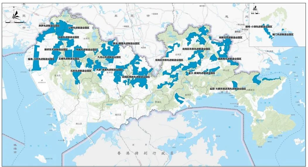 深化先进制造业园区布局,以《深圳市20大先进制造业园区空间布局规划》为依据,落实国土空间开发保护格局,衔接法定图则工业用地布局,结合全市重大产业项目选址及可释放工业用地潜力分布等情况,局部深化先进制造业园区空间范围,在宝安、龙岗、龙华、坪山、光明、盐田、大鹏新区、深汕特别合作区8个区布局20大先进制造业园区,引导战略性新兴产业制造环节集中布局,总用地面积约300平方公里。园区依托各自产业基础和资源禀赋,明确了差异化的产业发展方向,实现错位协同发展。