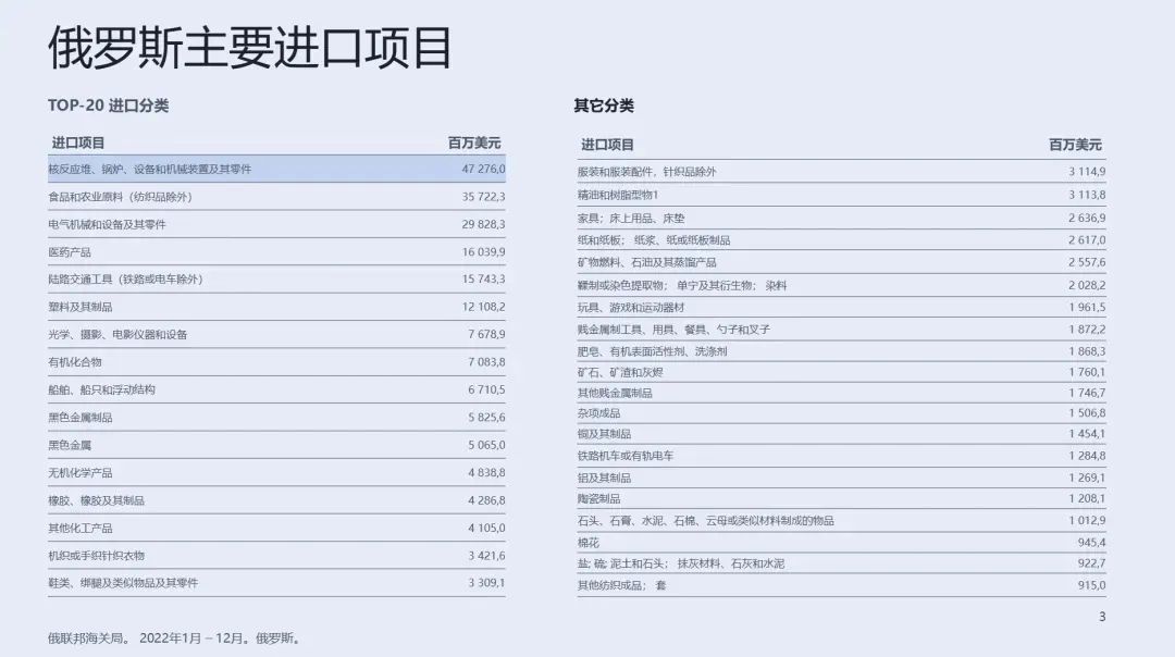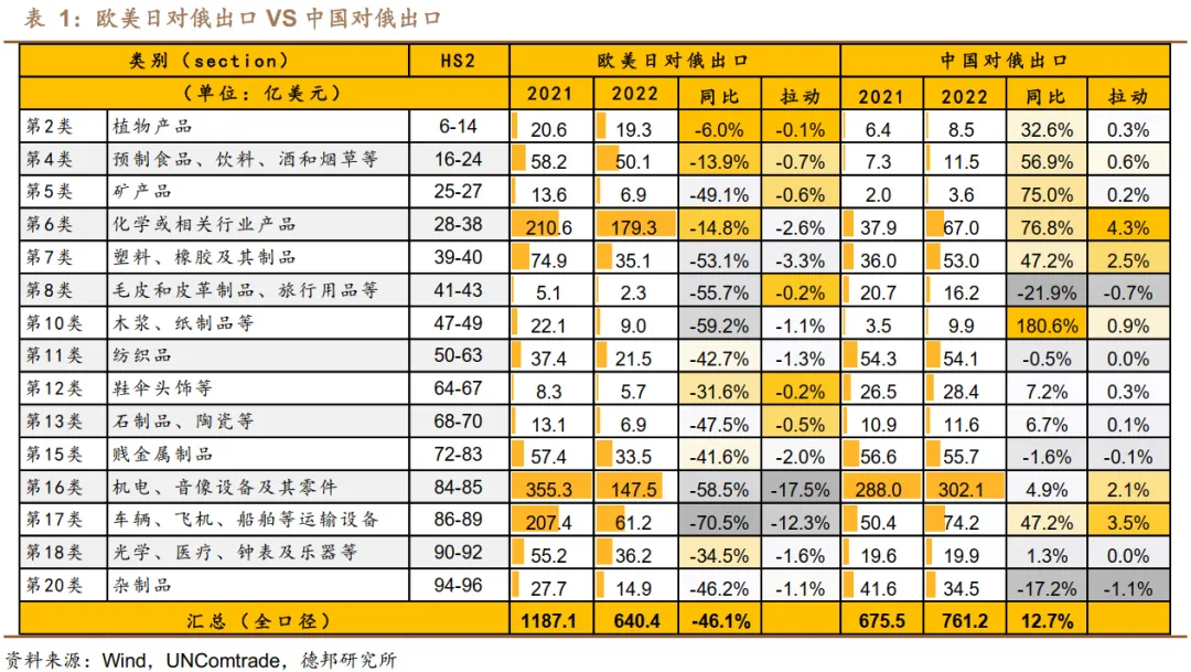 国际冲突后,替代效应最显著的是运输设备、塑料橡胶和化工,欧美日对俄出口分别下降70.5%、53.1%、14.8%,中国进口增加47.2%、47.2%、76.8%。简而言之,从欧美进口大量减少,其中三大类由中国快速补足。