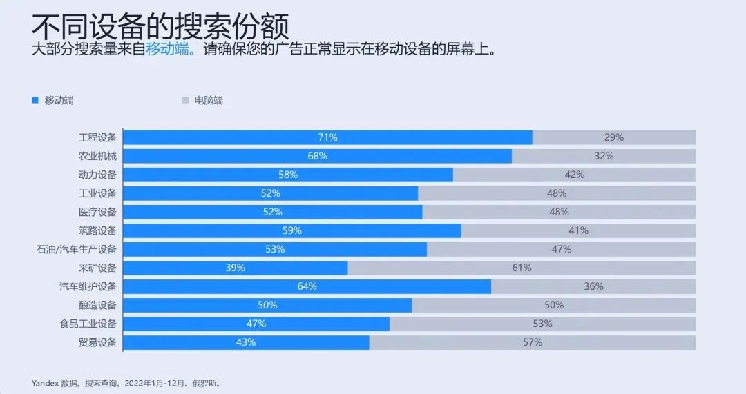 数据显示对中国B2B各领域的机械设备搜索主要来自移动端,这也提示着中国外贸企业的海外独立站需要适配不同的终端。