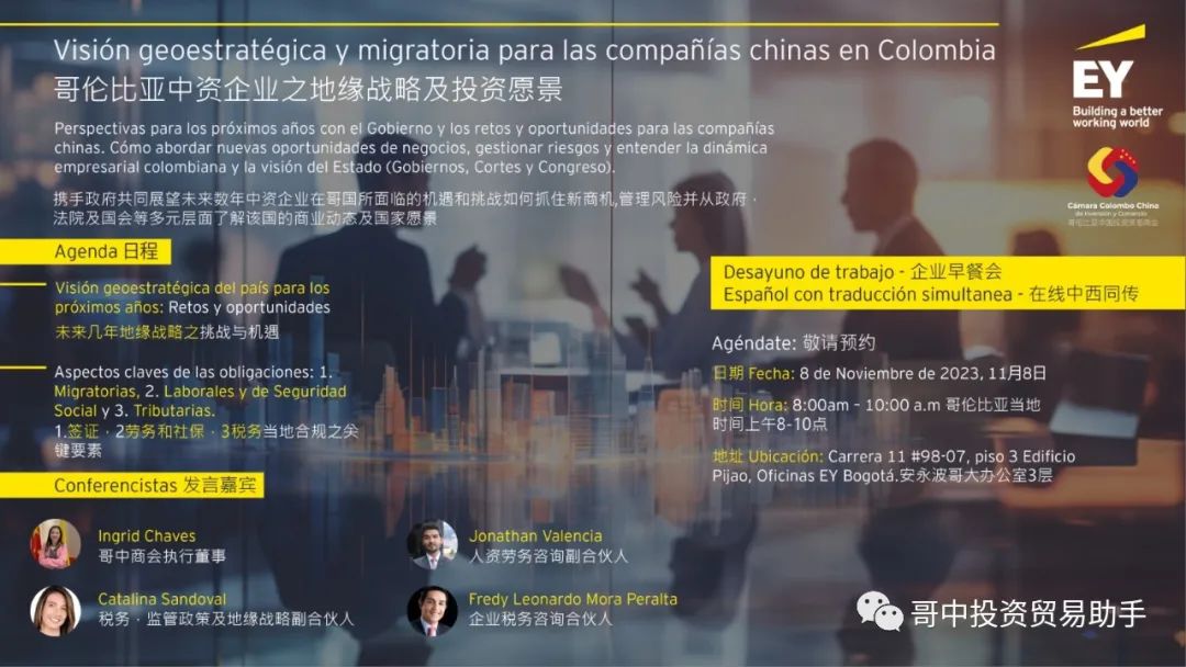 哥伦比亚中国投资贸易商会携手安永会计师事务所诚邀您参加题为“哥伦比亚中资企业之地缘战略及投资愿景”的企业早餐会!本活动旨在携手政府共同展望未来数年中资企业在哥国所面临的机遇和挑战如何抓住新商机,管理风险并从政府,法院及国会等多元层面了解该国的商业动态及国家愿景。