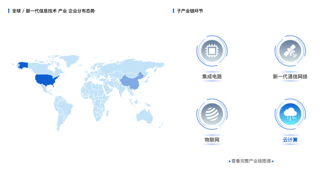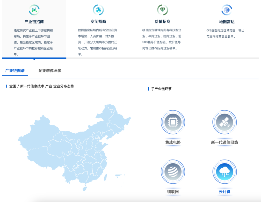 数联产服打造的产业招商地图,以产业链研究和企业大数据为核心,面向重点战略新兴产业构建产业链图,以微观企业为切入口构建招商对象评估体系,形成投资导向和作战指引,助力产业分析和精准招商。