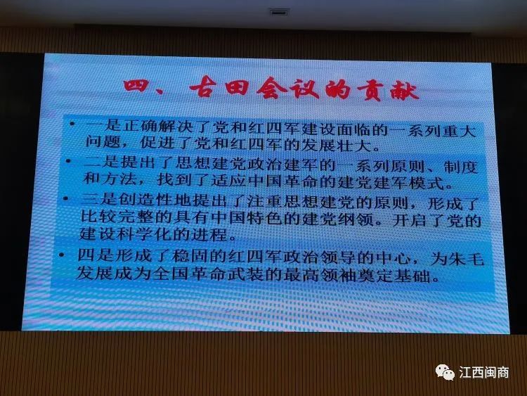 江教授从古田会议召开的背景、古田会议的成功召开、古田会议的意义、古田会议的贡献等四个方面,深入浅出介绍了古田会议的历史地位、历史贡献和它的伟大意义,对我党我军建设发展的指导意义。特别是对我们当前开展主题教育的现实意义。