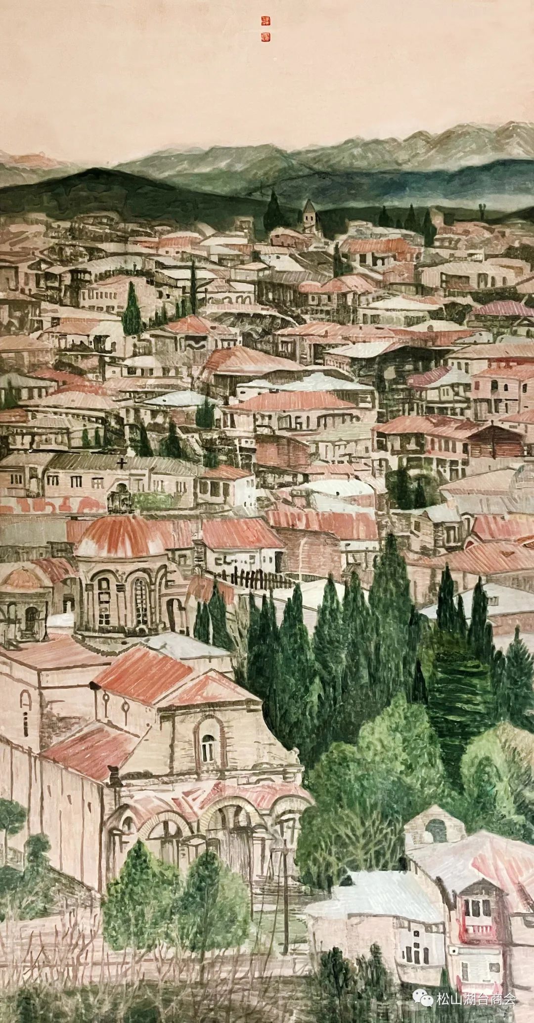 也是沿用之前积色点彩的方法,国画的构图'西画的用色用笔,基本上用一个基调'营造一个温暖静谧的氛围!这件作品入围"2 0 2 0雨花满天全国山水画作品展"。