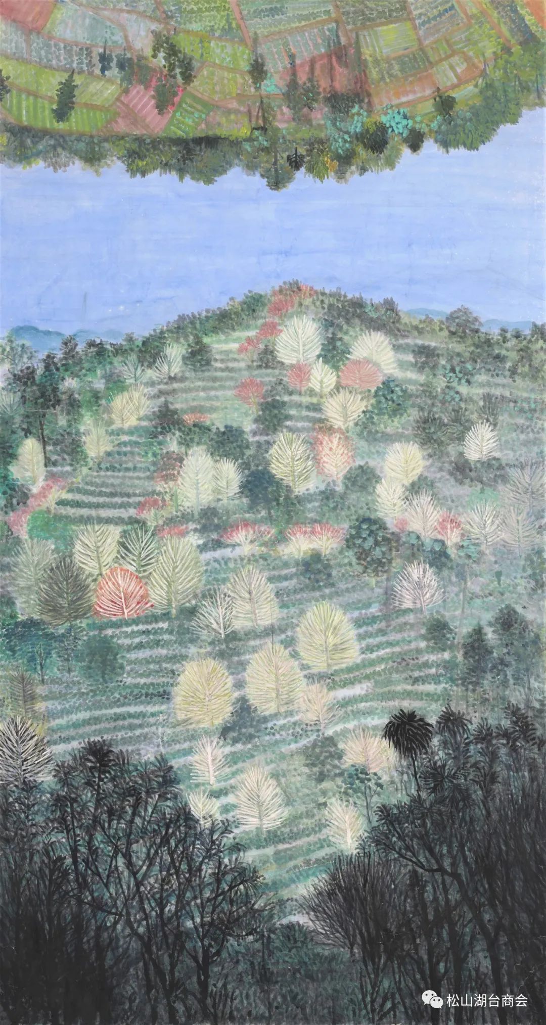 我的家乡盛产绿茶,红茶,六堡茶,作品中所描述的景像正是家乡的茶园,我用积色点彩的方式,以色当墨,层层点染,构图借鉴摄影作品,空白处为天?为水?留给观众想像空间。
