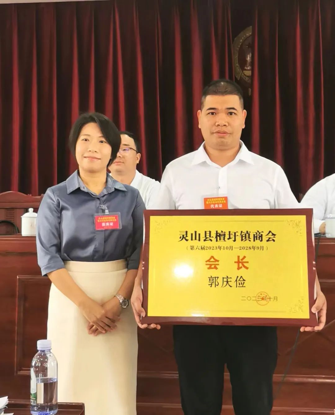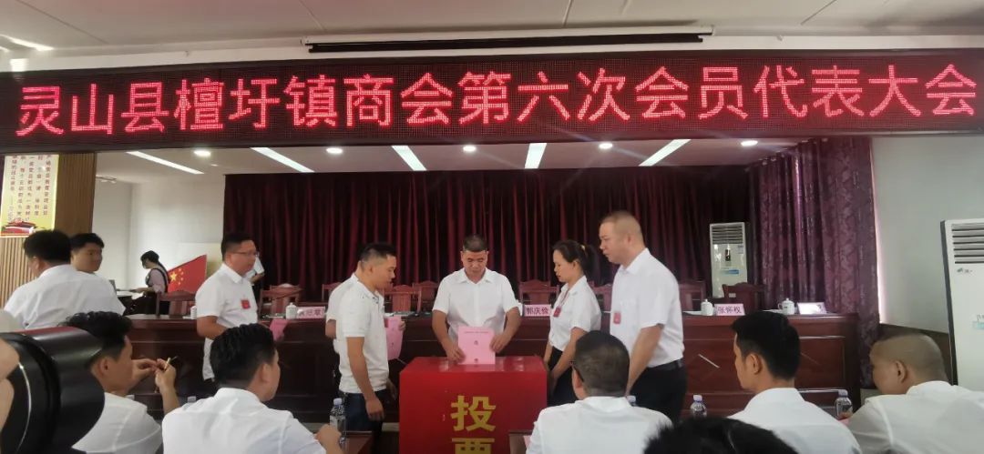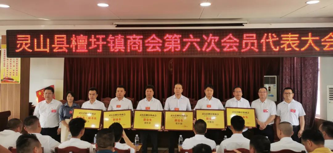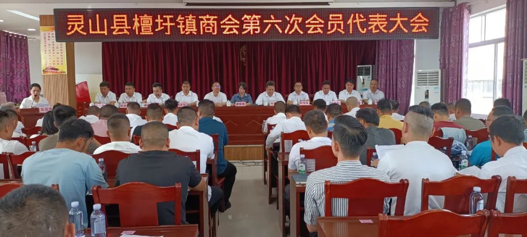 10月31日,檀圩镇商会第六次会员代表大会在檀圩镇政府四楼会议室召开,会议圆满完成大会各项议程,大会回顾了商会五年来工作,选举产生了檀圩镇商会第六届执行委员会,郭庆俭当选了檀圩镇第六届执行委员会会长,张怀权、谢德永、劳开禄、陈彬廷、黄旺章、邓鹏恩当选为副会长,谢德永当选为秘书长。县工商联主席谭菲菲,檀圩镇党委书记韦朝广出席会议并讲话,灵山县工商联党组成员、副主席曾芝达,檀圩镇党委副书记、镇长周建仕,镇人大主席郭俊荣等领导亲临大会指导。