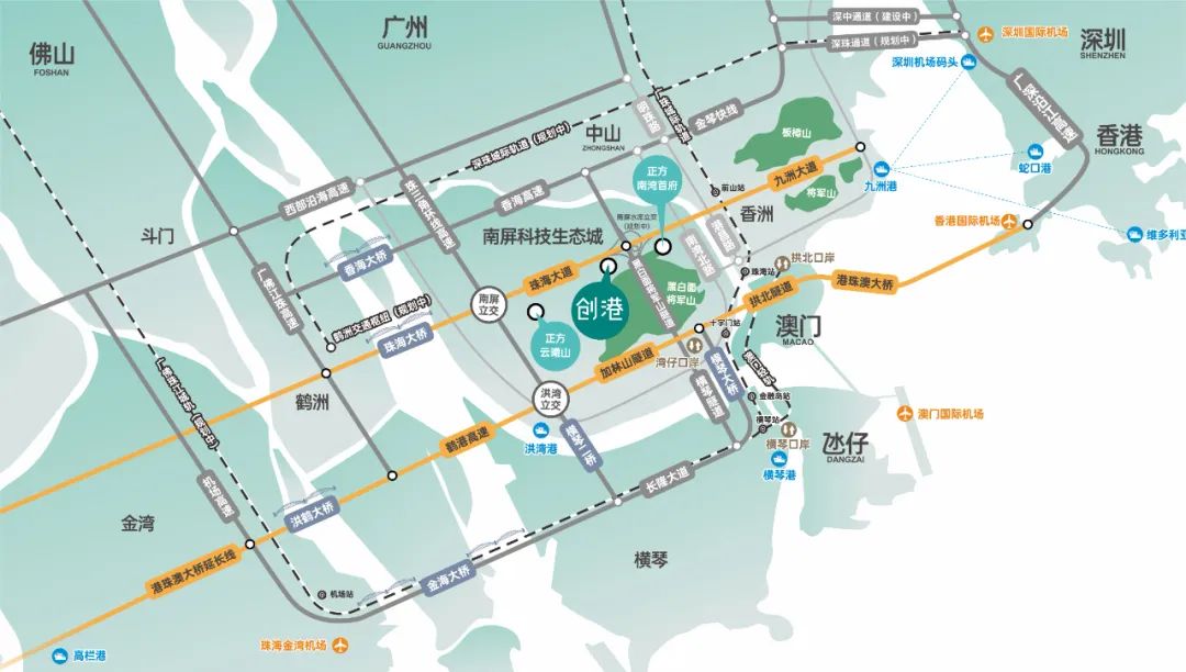 香洲创港中心直距珠海大道约350米,经由鹤洲北隧道接驳珠海中心站(鹤洲)枢纽,交通上畅达珠海西区,辐射湾区各地,快速融入湾区经济圈。不仅如此,项目紧邻南屏互通立交,连接黑白面将军山隧道快速接驳横琴,承接琴澳产业外溢,畅享极佳的营商环境。