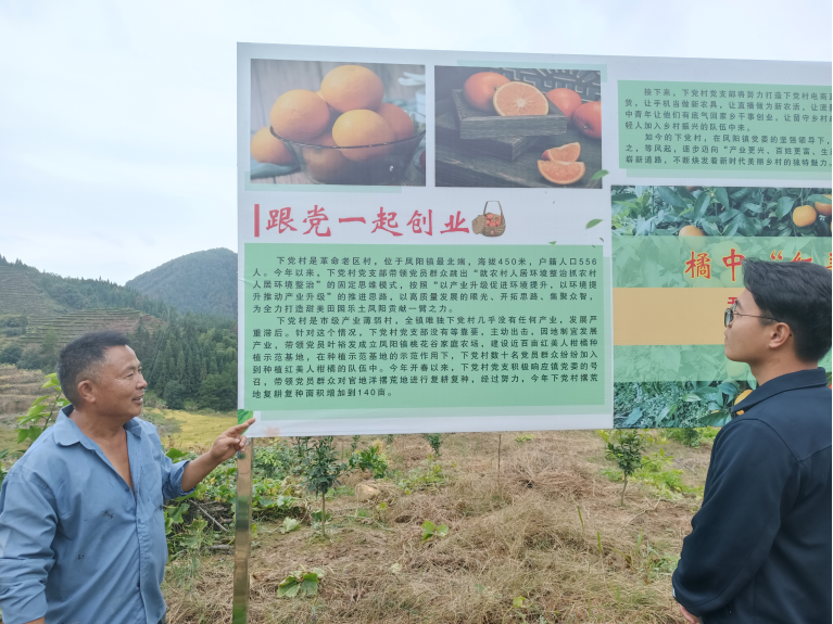 下党村是革命老区村,位于凤阳镇最北端,海拔450米,户籍人口556人。该村主要经济收入依靠毛竹、茶叶,产业基础薄弱,经济效益低下,很多村民选择外出务工,留下大片的土地荒芜,无人耕作。为促进群众增收致富,下党村党支部主动出击,因地制宜发展“红美人”柑橘产业。