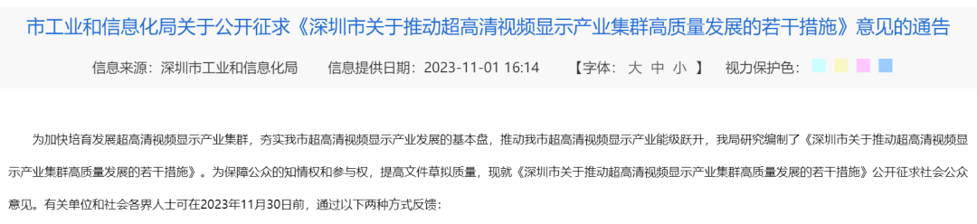 10月31日,深圳市工业和信息化局发布《深圳市关于推动超高清视频显示产业集群高质量发展的若干措施(公开征求意见稿)》(以下简称《征求意见稿》),提出要推动产业能级跃升、增强自主创新能力、完善产业生态布局。