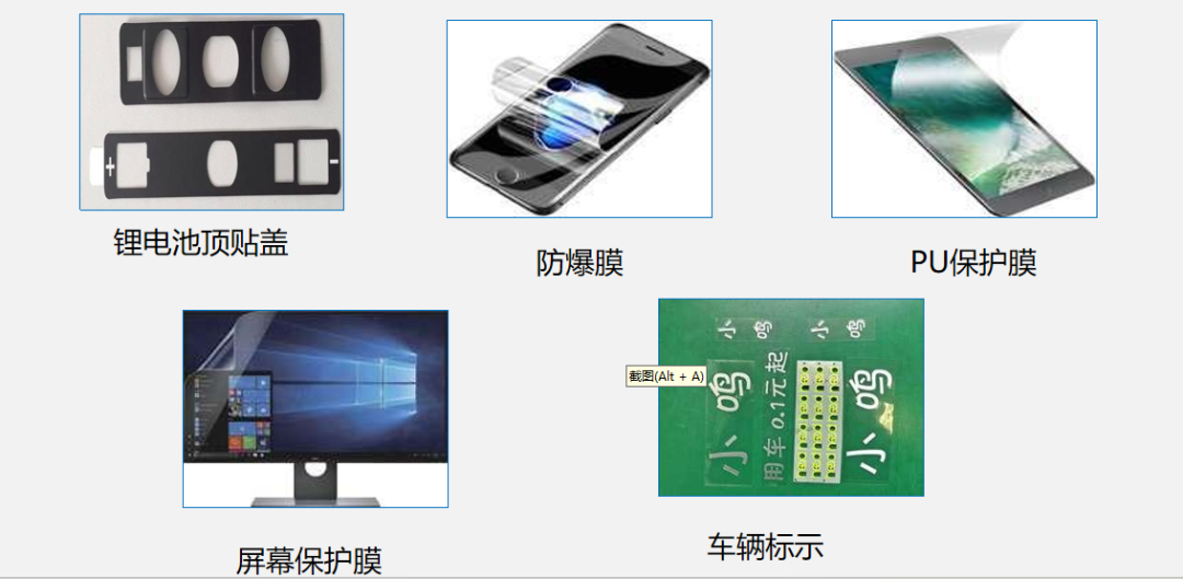 一般使用在产品的表面,通过选用不同的材质实现防刮、防反光、放反射、防窥、防被污染等功能。通过印刷也能起到标示、宣传、引导等功能。常用材质有:PET、PE、PP、PVC、OPP……