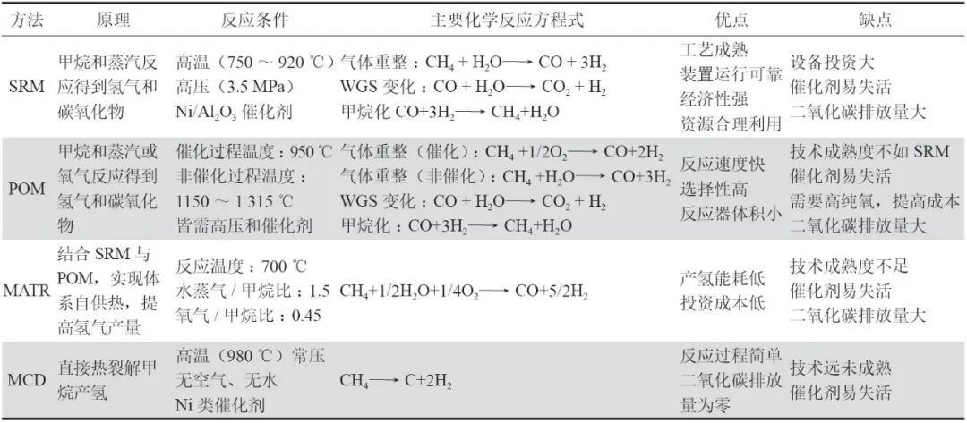 表1 主要甲烷制氢技术路线及其优缺点对比表