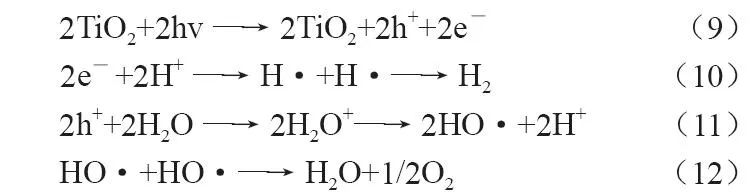 光催化制氢技术旨在利用光合成技术驱动化学反应,从水或有机物中制取氢气,目前研究最为广泛亦最具前景的是光解水制氢技术。光解水制氢技术的实质是利用半导体材料作为催化剂驱动水的分解。根据固体材料的能带理论,当入射光子的能量大于半导体光催化剂的带隙时,电子可以从价带(VB)激发到导带(CB),并分别产生光生空穴和电子对,空穴将水中的OH-氧化得到O2,电子将水中的H+还原生成H2[35]。以典型的纳米TiO2催化剂为例[36] ,光解水制氢反应如下:
