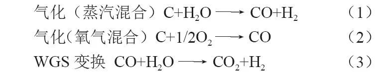 煤制氢主要工艺是将煤与氧气或蒸汽混合,在高温下转化为以H2和CO为主的混合气,后经水煤气变换(WGS)、脱除酸气、氢气提纯等流程,获得具有高纯度的氢气产品[6]。煤气化制氢过程中主要发生的有效反应如下: