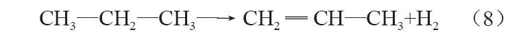 石化副产氢主要包括炼油重整、丙烷脱氢、乙烯生产等副产氢。丙烷催化脱氢生产丙烯(PDH)技术是指在高温催化条件下,丙烷分子上相邻两个C原子的C—H键发生断裂,脱除一个氢气分子得到丙烯的过程(反应式8)。该过程原料来源广泛、反应选择性高、产物易分离,副产气体中的氢气占比高、杂质含量少,具有重要的收集利用价值,越来越受到人们的青睐。