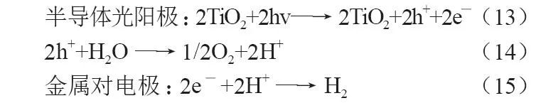 光电催化是指在光照射下,半导体光阳极吸收光子产生电子—空穴对,其中空穴直接在光阳极将OH-氧化得到氧气,而光生电子则在外加偏压下流经导线到达金属对电极,并在对电极上还原H+产生氢气。该技术可以有效减少电子—空穴对的复合,从而提高产氢效率。早在1972年,日本东京大学的Fujishima和Honda利用TiO2半导体单晶薄膜作为电极,首次实现了光电催化水分解生成氢气。光电催化水分解反应过程如下:、