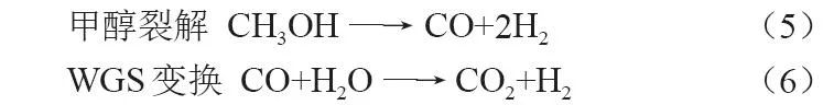 反应热力学和反应机理的研究结果证实,该反应是通过甲醇裂解与WGS变换两步反应完成的: