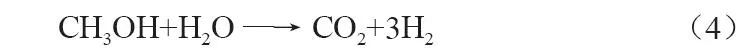 与天然气和煤炭相比,以甲醇为代表的二次石化能源产品来源丰富且更易储输。甲醇制氢具有反应温度低、氢气易分离等显著优势,近年来一直备受关注。蒸汽重整法是目前使用最为广泛的甲醇制氢技术路线[9],甲醇和蒸汽在高于200 ℃环境中通过催化剂床层,其主要化学反应式如下:
