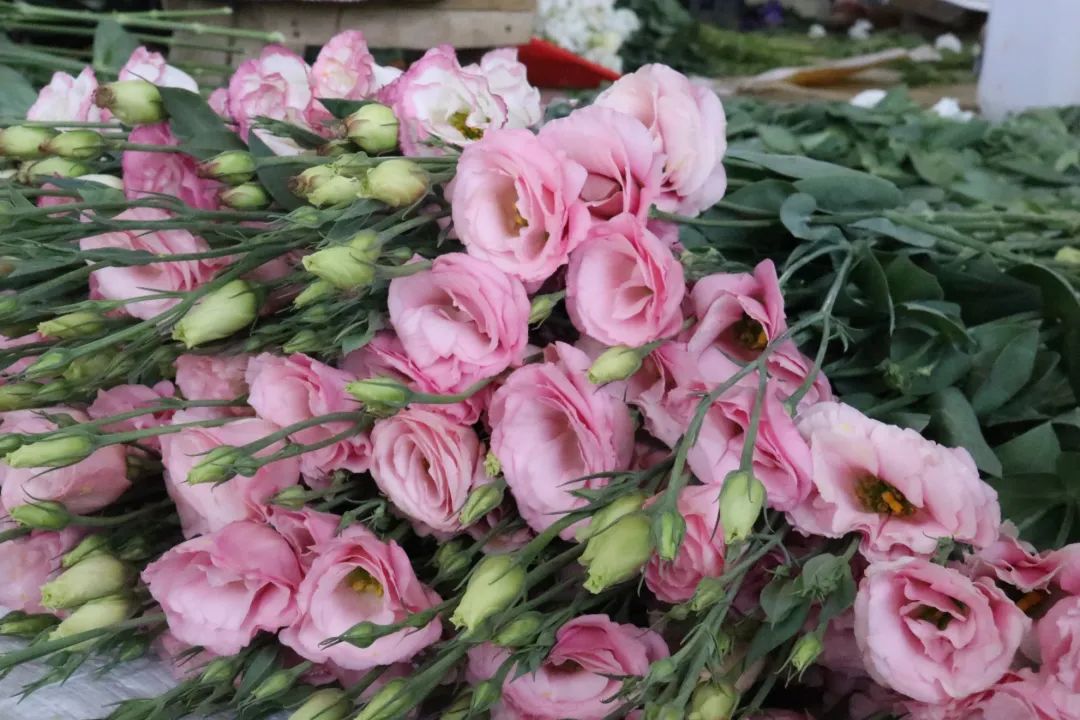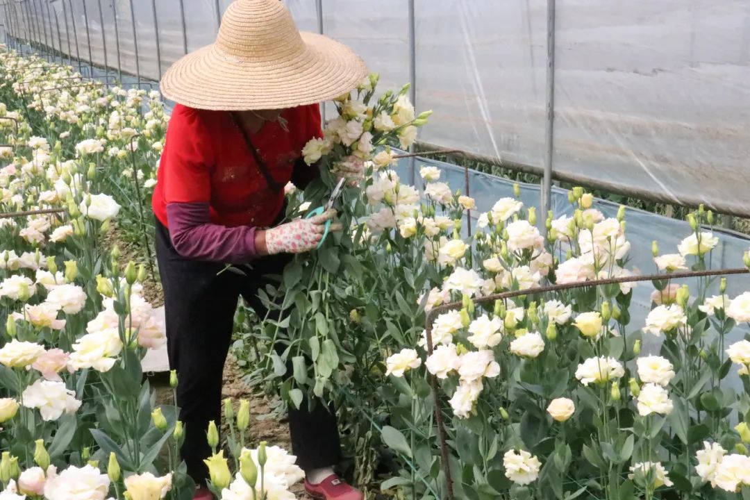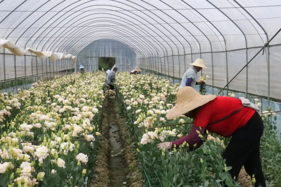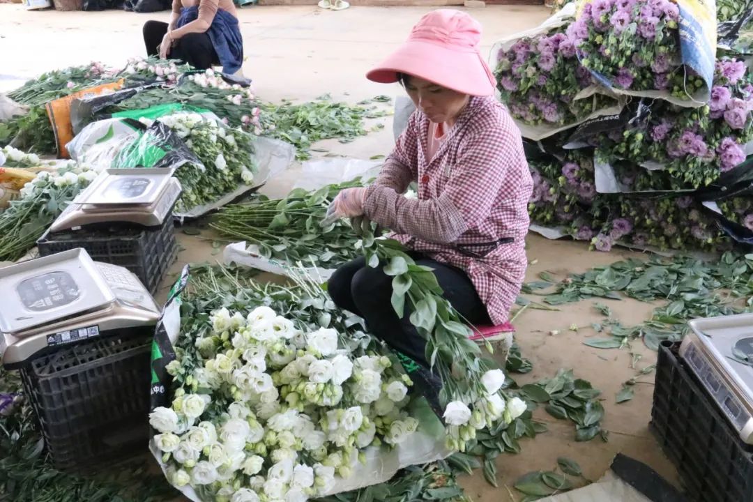 另一批工人在对刚采摘的洋桔梗进行仔细的分拣、称重、捆扎、包装,赶在当天装车发货,经昆明斗南花卉市场销往全国各地,将这花团锦簇的浪漫送到更多热爱生活的人手中。