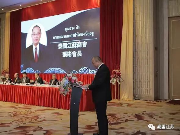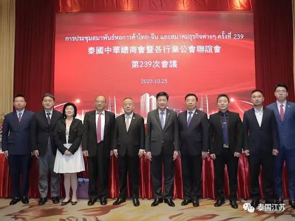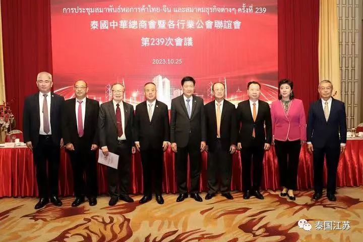 2023年10月25日,泰国中华总商会暨各行业公会联谊会于泰国中华总商会光华堂举行第239次会议,联谊会议旨在促进各行业之间的交流合作,来自75家各行业商协会200余名领导、代表共聚一堂交流分享,泰国江苏商会作为联合做东单位,张彬会长专题推介《水韵江苏》、汇报《江苏商会第二届执委会工作报告》。