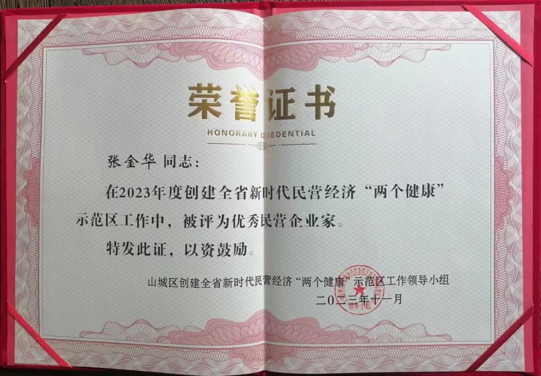 河南金华电气有限公司总经理张金华荣获“优秀民营企业家”。