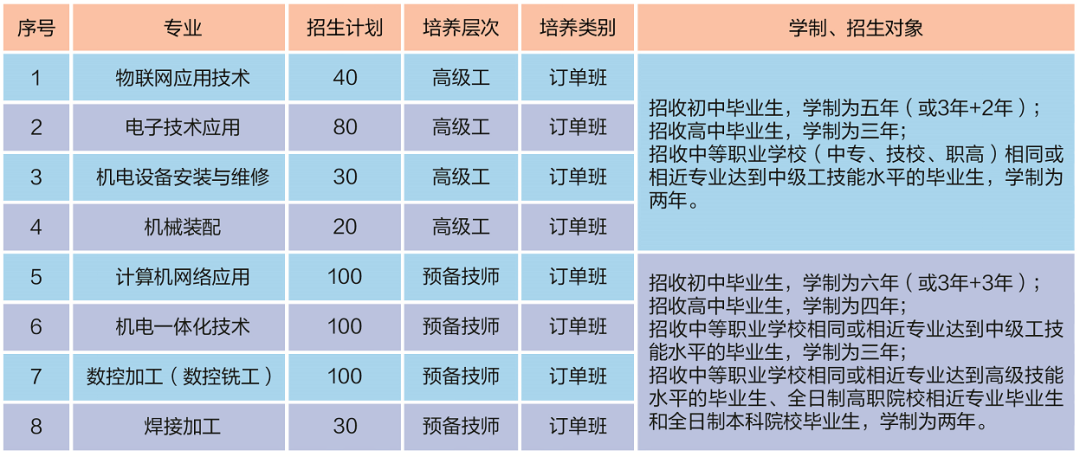 招收中等职业学校(中专、技校、职高)相同或相近专业达到中级工技能水平的毕业生,学制为两年。