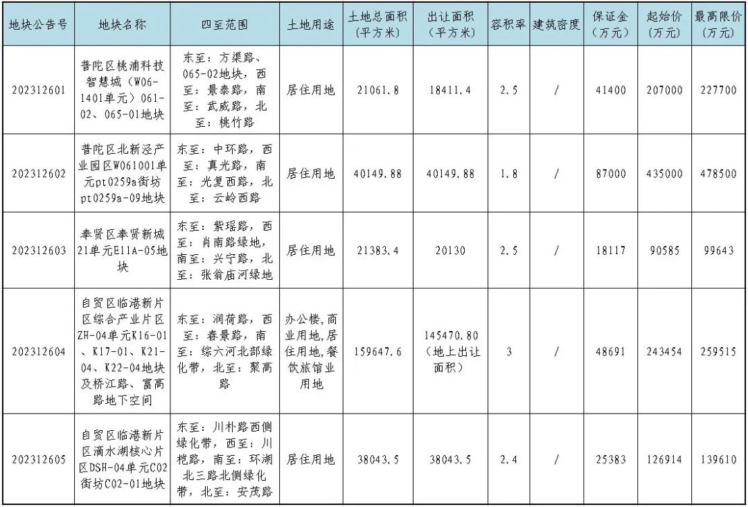 根据国家有关法律、法规和《招标拍卖挂牌出让国有建设用地使用权规定》、《上海市土地使用权出让办法》等规定,发布涉及普陀区、奉贤区、临港3个地区共计5幅国有建设用地使用权的公告。有关情况公告如下: