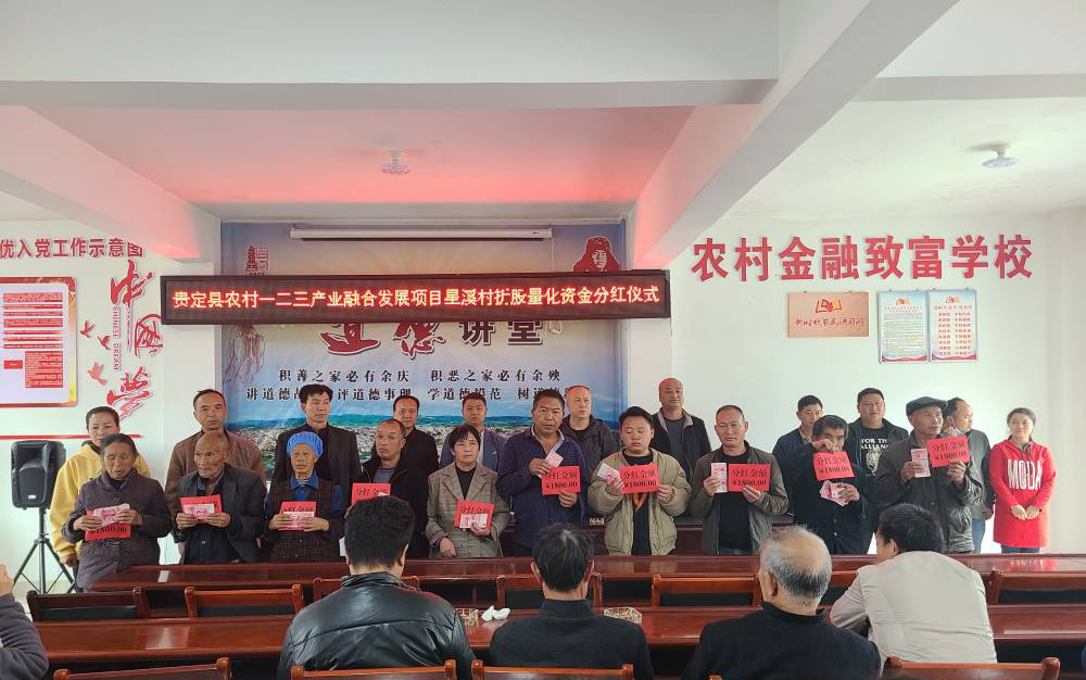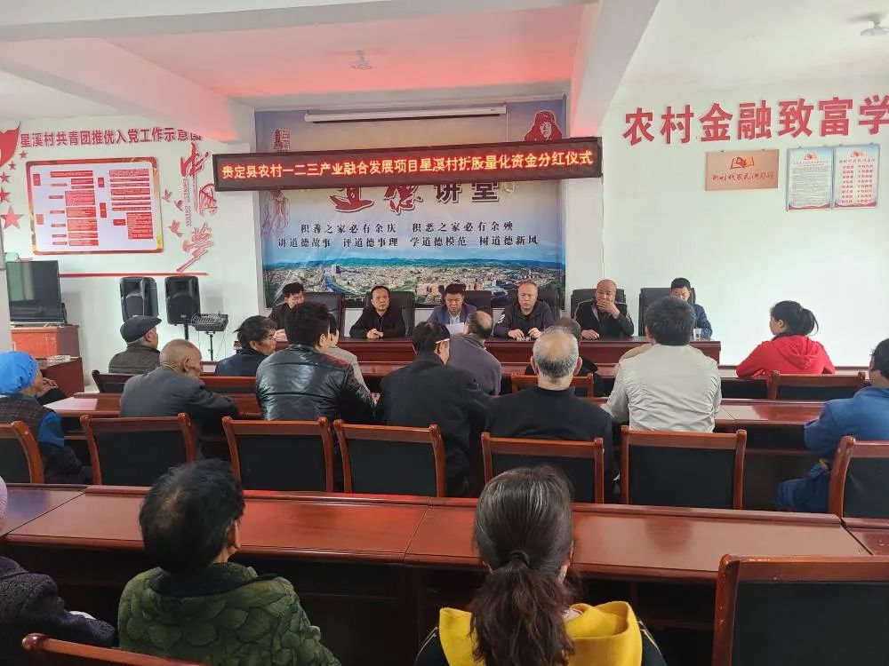 为持续巩固脱贫攻坚成果,全面推动乡村振兴工作,4月14日,星溪村举行“贵定县农村一二三产业融合发展项目星溪村折股量化资金分红仪式”,镇党委副书记刘嵩出席仪式,星溪村“两委”、乡村振兴驻村工作队全体成员及享受入股分红的建档立卡户参加。