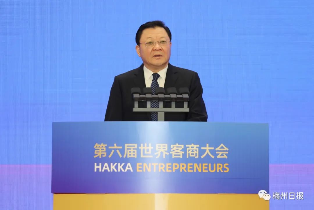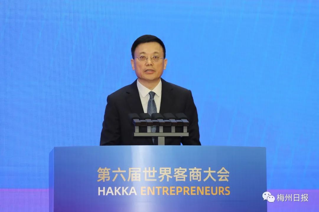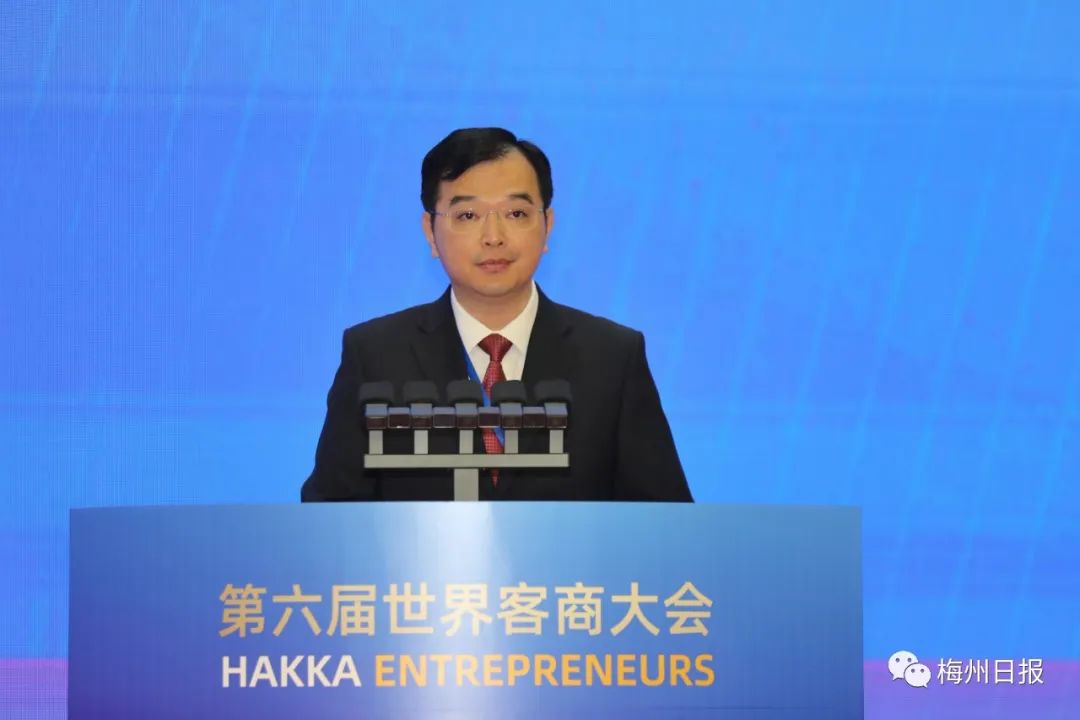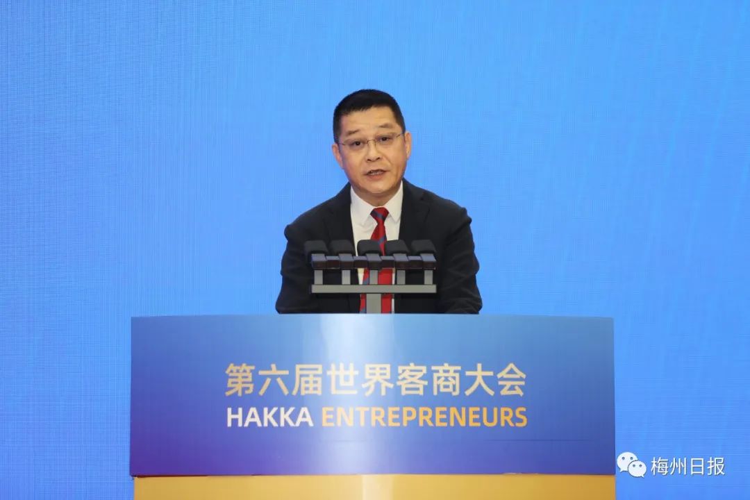 世界客商大会发起人之一曾智明(深圳市梅县商会荣誉会长)宣读《全球客商助力中华民族伟大复兴倡议书》大会现场还播放福建、江西、广东三省苏区振兴发展投资推介片,举行全球客商支持“百千万工程”启动仪式。