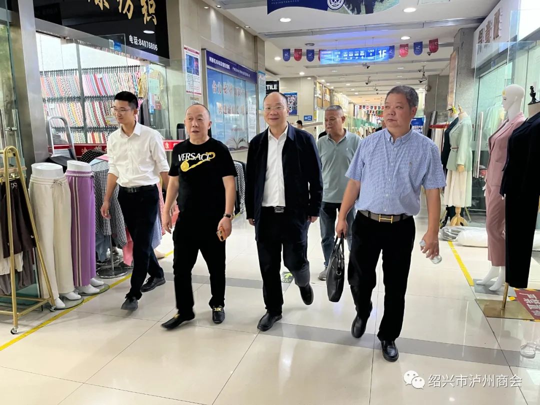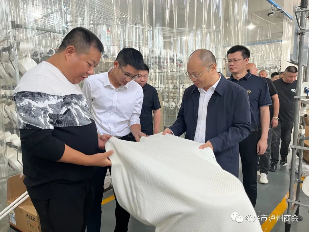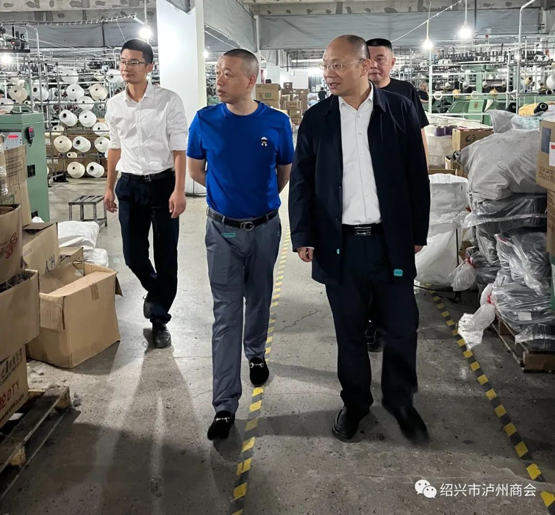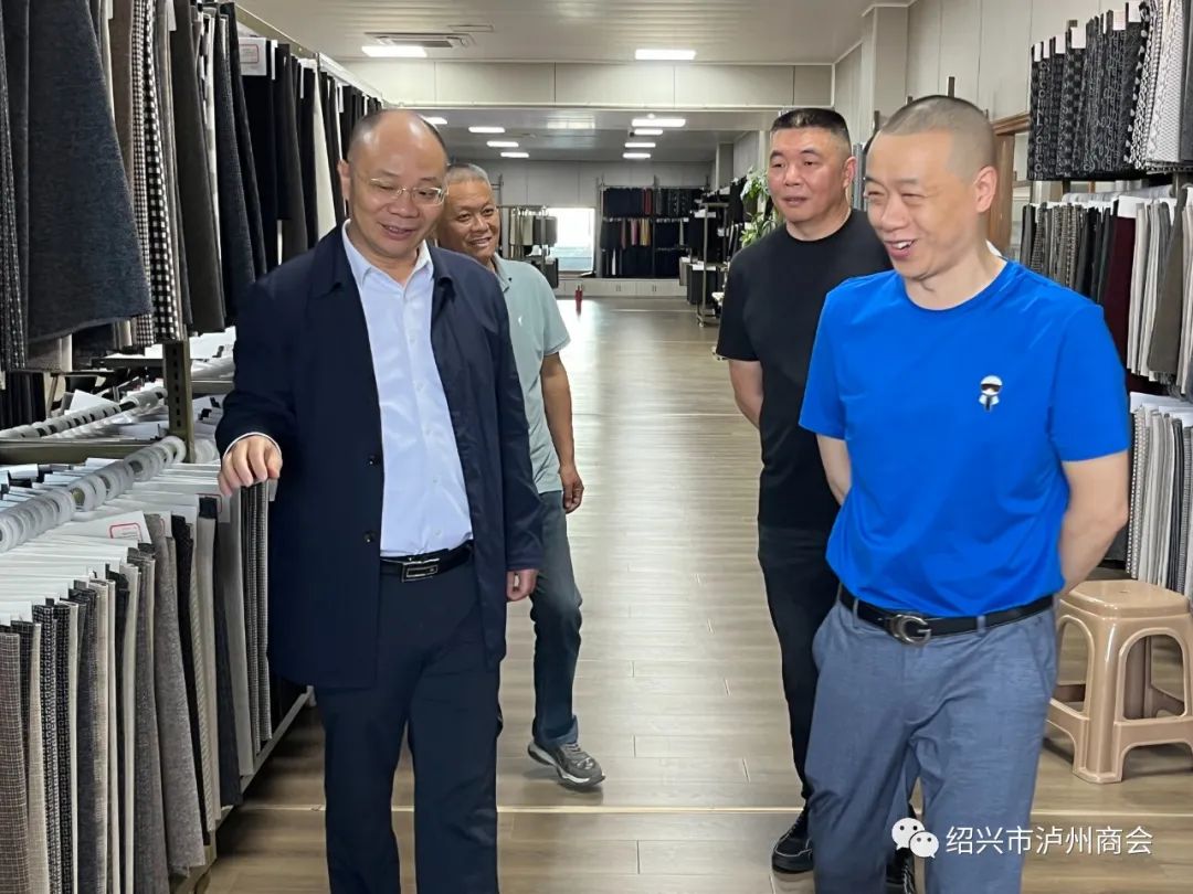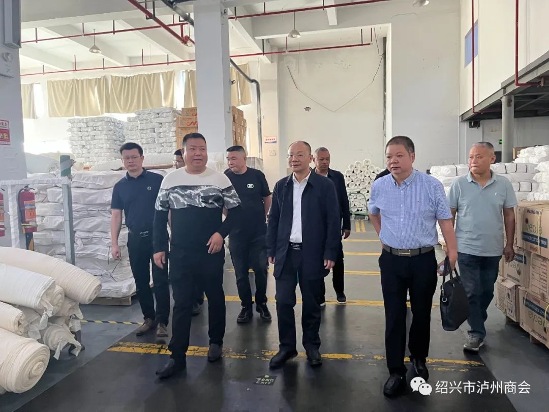 11月1日上午, 泸县立石镇党委书记艾斌、泸县党委委员武装部长副镇长王孝荣、泸县驻苏州招商局局长谢存平等领导一行,参观考察了绍兴市泸州商会常务副会长单位----绍兴布国针纺有限公司。商会秘书长姜朝树、常务副会长武永财、邱欢,共同参加陪同。