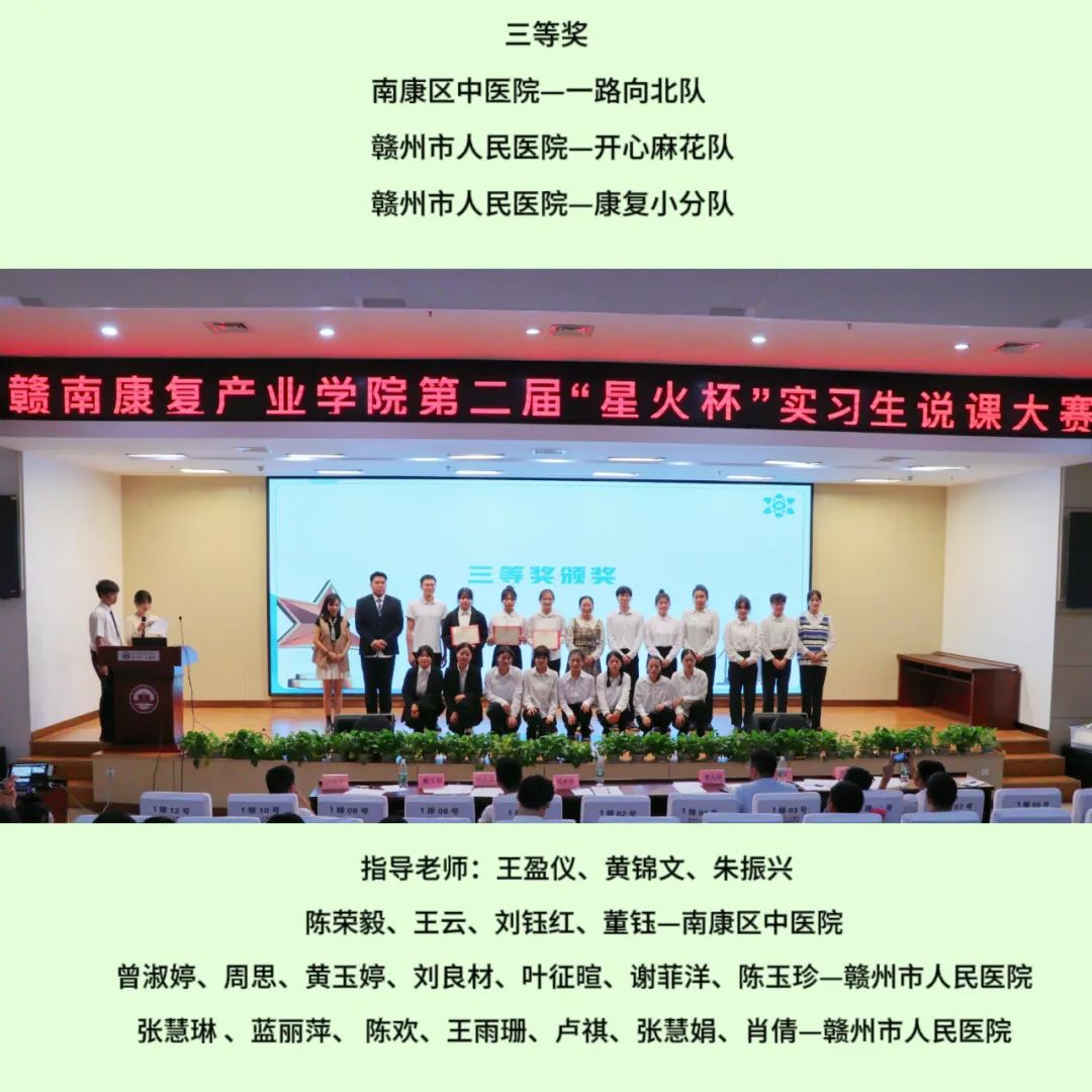 比赛结束后,赣南卫生健康职业学院康复教研室主任钟人龙、南方医院赣州医院康复医学科治疗师长戴文娟、粤北人民医院治疗师长张林剑分别对获奖同学表示祝贺并对此次比赛进行了点评。最后,吴桂华副主任总结,希望同学们不断的提升自己,发掘潜力,在未来的学习和工作道路上实现自我价值和社会价值。