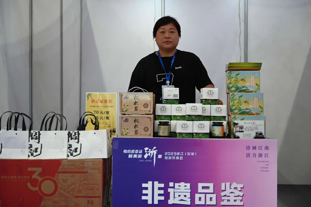 8个特色文旅市集展位则分布在展厅外围,其中非遗品鉴类4个、百县千碗类1个、宝藏小店类3个,包括带来了枇杷露等产品的小稠农旅发展有限公司、带来了无骨花灯的仙居吉弘灯彩有限公司、带来了烤鱼片等产品的温岭市石塘馋海水产干制品小作坊、带来了人参复合片的浙江华景生物科技有限公司等。