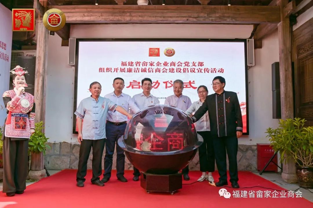 由福建省工商联党组成员副主席叶善青,中共福建省委统战部原常务副部长、福建省人大常委会人事代表工作室原主任翁卡,中共福建省委统战部民宗处处长林海,福建省民族与宗教事务厅民族经济发展处处长李瑛,福建省畲家企业商会党支部书记、会长雷和孙,福建省畲家企业商会轮值副会长雷禄鑫共同上台正式启动廉洁诚信促发展仪式。