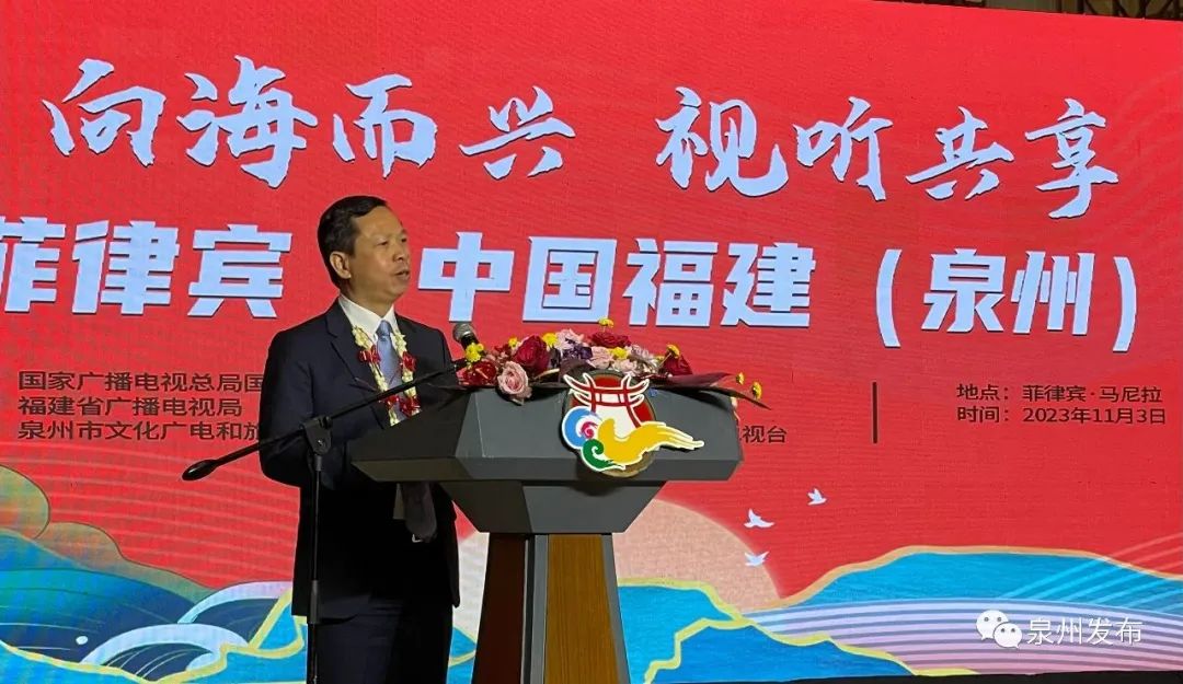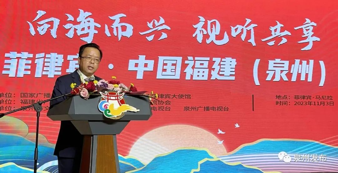 相知无远近,万里尚为邻。中菲传统友谊缘起海洋,绵亘千年。早在宋元时期,泉州人便从刺桐港出发,顺着海上丝绸之路扬帆南下,与菲律宾诸岛建立起密切的经贸、文化联系,时至今日,在菲华侨华人中,十之八九祖籍泉州。我们相信,通过多彩荧屏和精彩舞台,大家都能在这场活色生香的闽南文化大观园里,欣赏到南音、高甲戏、梨园戏、木偶戏等戏曲精品,尽情感受闽南文化精粹和独特艺术魅力,让闽南文化在这里落地生根、开花结果。菲律宾华侨华人站在东西方文明对话前沿,是中菲友好的天然使者和中坚力量,我们希望,广大华侨华人、来宾朋友们能够以本次活动为契机,深化交流互动、增进两地情谊,推动双方合作朝着更宽领域、更深层次、更高水平迈进,共同打造一场永不落幕的文化盛宴。我们欢迎,同胞乡亲们常回泉州、品味泉州、感悟泉州,实地体验闽南风俗、了解闽南风情、感受闽南艺术,共同推介推广、传承弘扬闽南文化,让闽南文化成为世界文明百花园里的绚丽花朵。