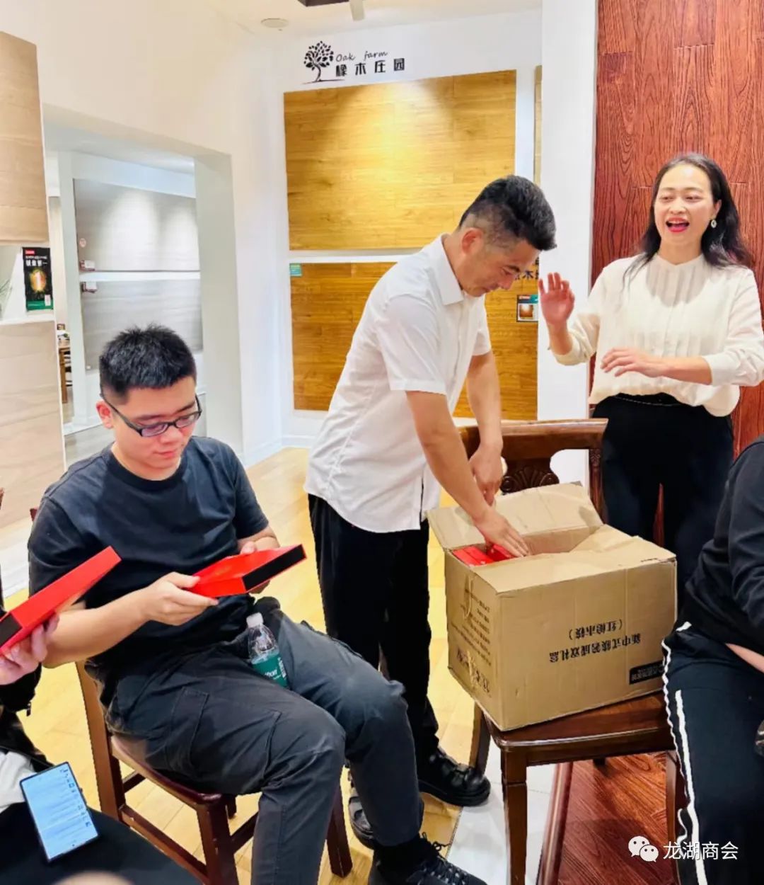 随后大家驱车来到光彩建材市场内的龙湖商会会员单位大自然地板,受到总经理高俊涛、姜珊夫妇的热情接待。姜珊总经理给大家讲解了大自然实木地板的特色以及健康环保的地板产品,同时还向大家介绍了他们在蚌埠的创业史。作为行业领军品牌的大自然地板,虽然在国内外屡获行业大奖,但在1998年入驻蚌埠时,知名度却不高,展厅面积仅有60平方,两个年轻人凭着一腔热情和真诚服务得到了客户的认可和满意,最终赢得了市场。经过数十年如一日的专注地板这一件事,现在店铺面积增至400平方,同时由单店发展成多店,在经营过程中,始终严把质量关,以服务好客户为工作中心,历经岁月沉淀,大自然地板已成为蚌埠千万家庭的口碑之选。最后高俊涛总经理还赠送了特制的木制礼筷给到访的家人们,寓意大家快快乐乐,万事顺意。