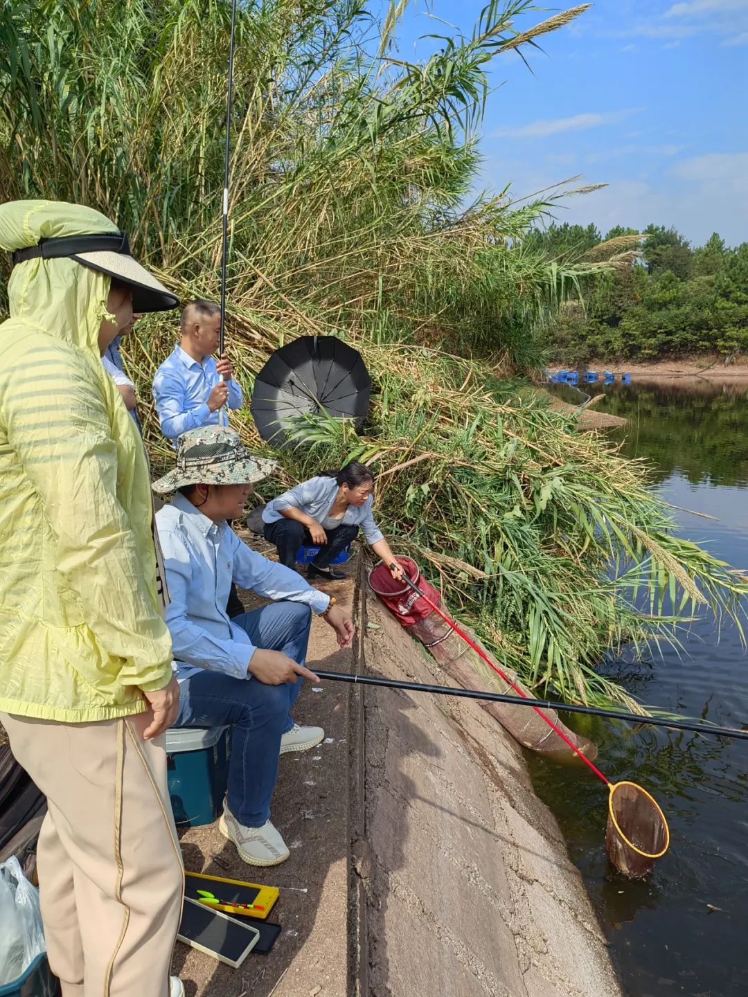 在商会办公楼下,中巴八点半准时出发。到达目的地时,自驾而来的人们已三三两两布滿了勃垄坑水库,有的已抛竿垂钓,少有收获,有的摩拳擦掌,在拉竿上饵。勃垄坑水库呈一条似连非连条形项链状,150多人分布在多处弯弯曲曲的水边,人不见得很多。一圈转下来,看上去有些还挺专业的,有多套成套的太阳伞、凳椅,有钓鱼专用的箱、包、鱼竿。但细细一看,好多人好像也不太专业,一些人的鱼线被鱼拉掉多次,有的被拉去3次,有的动作也不够熟练专业,甚至鱼钩也拔不出来。所以钓鱼成绩也参差不齐。