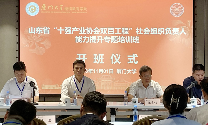 2023年10月31日至11月5日,山东省“十强产业协会双百工程”社会组织负责人能力提升专题培训班在厦门成功举办,本次培训是2023年山东省社会组织发展资金助力高质量发展项目之一。山东省民政厅党组成员、副厅长兼山东省社会组织管理局局长张孟强,山东省社会组织管理局副局长姬升峰,厦门大学继续教育学院院长许和山出席开班仪式,山东省信息产业协会秘书长高暘与近60名来自山东省“十强产业”协会的负责人参加了此次培训。