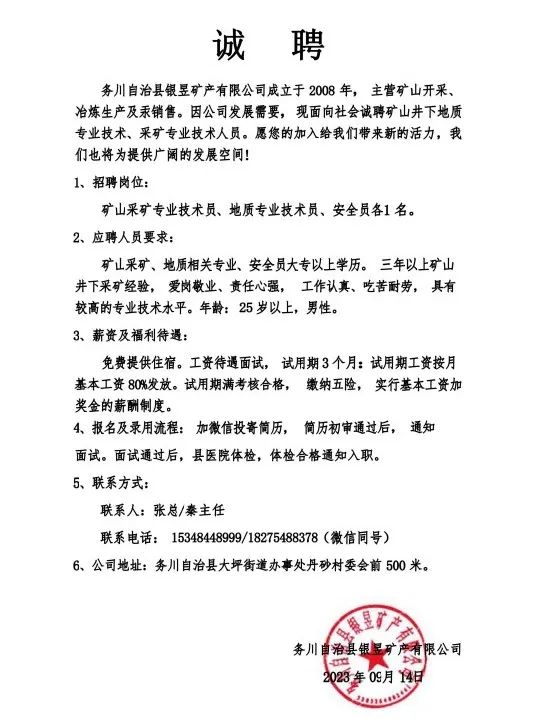 务川自治县银昱矿产有限公司招聘矿山采矿专业技术员、地质专业技术员、安全员各1名