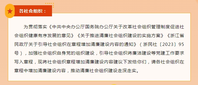 会议第二项议题,为贯彻落实《中共中央办公厅国务院办公厅关于改革社会组织管理制度促进社会组织健康有序发展的意见》《关于推进清廉社会组织建设的实施方案》《浙江省民政厅关于引导社会组织在章程增加清廉建设内容的通知》(浙民社〔2023〕95号),商会经过反复研究比较,提出将清廉建设纳入章程,由理事会进行举手表决,表决结果如下: