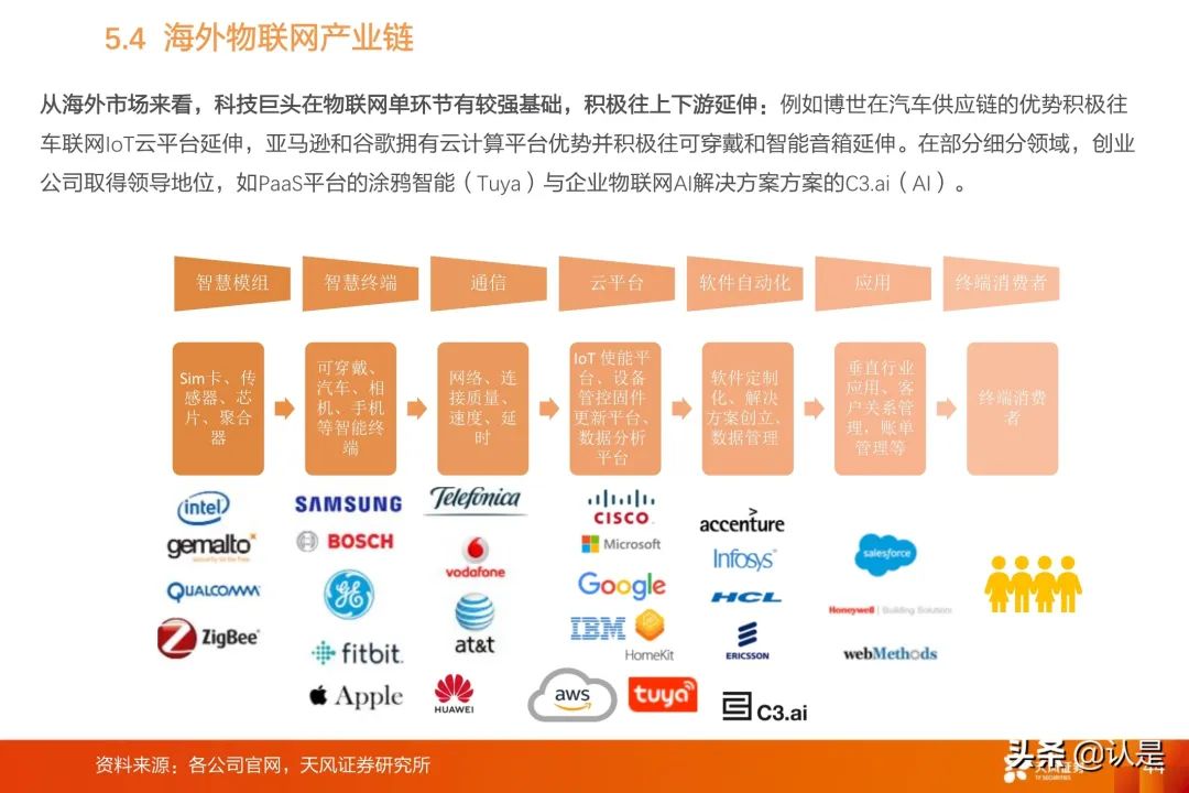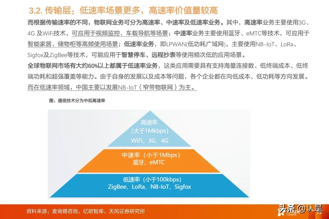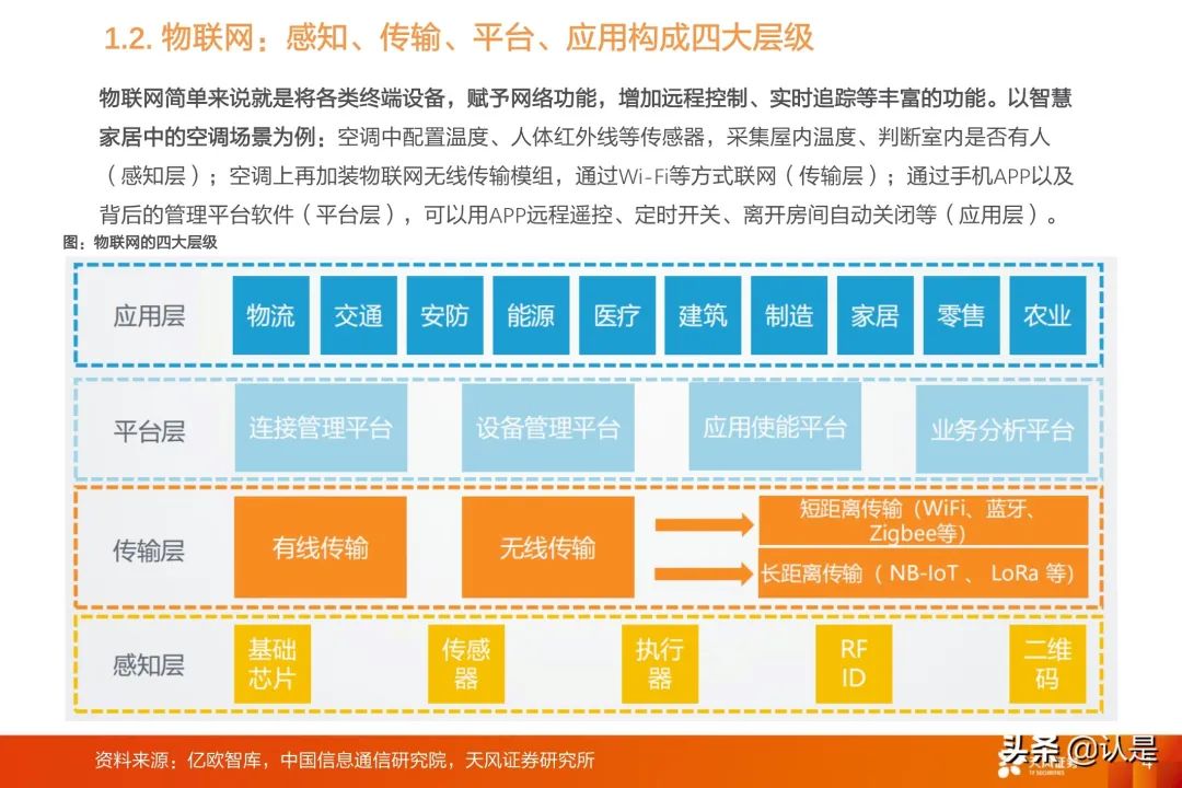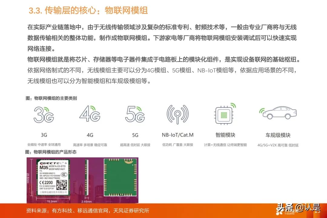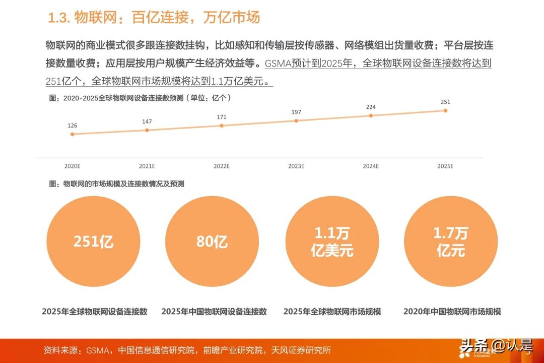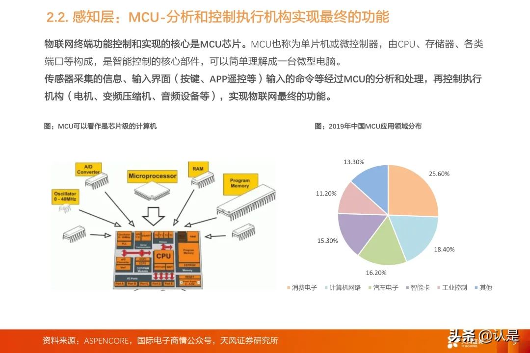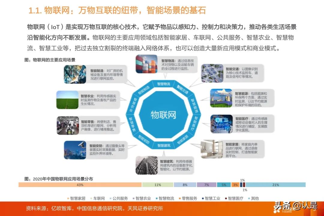 1 物联网——万物互联 万亿市场物联网(IoT)是实现万物互联的核心技术,它赋予物品以感知力、控制力和决策力,推动各类生活场景 沿智能化方向不断发展。物联网的主要应用领域包括智能家居、车联网、公共服务、智慧农业、智慧物 流、智慧工业等,把过去独立割裂的终端融入网络体系,也可以创造大量新应用模式和商业模式。物联网的商业模式很多跟连接数挂钩,比如感知和传输层按传感器、网络模组出货量收费;平台层按连 接数量收费;应用层按用户规模产生经济效益等。GSMA预计到2025年,全球物联网设备连接数将达到 251亿个,全球物联网市场规模将达到1.1万亿美元。2 感知层——物理感知的枢纽传感器是物和物之间得以相连的起点,是将接收到的物理感知转化为电信号的基本枢纽。传感器技术经过数十年的发 展,已经能够将各种场景下大部分物理状态信息采集转化为电子信息系统可以处理的电信号。像温度、湿度、压力 (重量)、气压(轮胎胎压)、光照强度、气体成分、指纹、面部识别、速度和位移等等,均可通过传感器进行采集 感知。这些传感功能,与智慧家居、物流、车辆安全监测、节能环保、安防等下游场景密切配合,可以组合形成丰富 的应用模式。物联网终端功能控制和实现的核心是MCU芯片。MCU也称为单片机或微控制器,由CPU、存储器、各类 端口等构成,是智能控制的核心部件,可以简单理解成一台微型电脑。 传感器采集的信息、输入界面(按键、APP遥控等)输入的命令等经过MCU的分析和处理,再控制执行 机构(电机、变频压缩机、音频设备等),实现物联网最终的功能。3 传输层——信息传递的管道3.1. 无线传输为主,短距离和长距离各擅胜场物联网的传输层以无线传输为主,按照传输距离的不同,无线传输又可以分为局域网(LAN)和广域网 (LPWAN)两种。局域网包括人们较为熟知的蓝牙、WiFi等,其特点是通信距离相对较短,一般在200米 范围以内,适合于室内、低移动性场景(智慧家居、智能仓库等)。广域网包括NB-IoT、Sigfox等,其特 点是通信范围大,可以达到15km以上,适合于大范围、移动性场景(车联网、物流跟踪、资产定位等)。3.2. 低速率场景更多,高速率价值量较高而根据传输速率的不同,物联网业务可分为高速率、中速率及低速率业务。其中,高速率业务主要使用3G、 4G 及WiFi技术,可应用于视频监控、车载导航等场景;中速率业务主要使用蓝牙、eMTC等技术,可应用于 智能家居、储物柜等高频使用场景;低速率业务,即LPWAN(低功耗广域网),主要使用NB-IoT、LoRa、 Sigfox及ZigBee等技术,可能应用于智慧停车、远程抄表等使用频次低的应用场景。全球物联网市场有大约60%以上都属于低速率业务,这类应用需要具有支持海量连接数、低终端成本、低终 端功耗和超强覆盖等能力。由于自身的发展以及成本等问题,各个企业都在向低成本、低功耗等方向发展。而在低速率领域,中国主要以发展NB-IoT(窄带物联网)为主。3.3. 传输层的核心:物联网模组在实际产业链落地中,由于无线传输领域涉及复杂的标准专利、射频技术等,一般由专业厂商将与无线 数据传输相关的整体功能,制作成物联网模组。下游家电等厂商将物联网模组安装调试后可以快速实现 网络连接。物联网模组就是将芯片、存储器等电子器件集成于电路板上的模块化组件,是实现设备联网的基础枢纽。 依据网络制式的不同,无线模组主要可以分为4G模组、5G模组、NB-IoT模组等,依据应用场景的不同, 无线模组也可以分为智能模组和车规级模组等。4 平台层——应用实现的桥梁计费、开通、应用实现、后端数据管理等硬件端具备物联网能力后,需要平台实现整个网络和应用的具体实现。平台按功能类型大致可以分为4类, 实际上很多通用化平台兼具多个功能。1)CMP/DMP管理平台:设备连接的管理。举个例子,买一个扫地机器人,回家开机激活,与手机APP绑定 等,这些都是通过管理平台实现。2)AEP应用使能平台:很多传统公司(比如插排工厂),想升级成物联网遥控插排,但是没有相应的技术人 员,他们就可以付费使用AEP平台,AEP平台上汇聚了很多物联网解决方案,插排工厂在平台上设置产品参 数(有几个插孔)、功能模块(手机控制开关、定时开关等),就可以直接生成需要的物联网功能。3)BAP业务分析平台:物联网采集了大量用户数据,有专门的平台来分析用户数据,通过大数据让设备的 功能更加智能,也可以通过对用户习惯的分析做定制化营销等等拓展功能(比如智能门锁给老年人用,每天 都开门,突然一整天都没出门,就给家人报警是不是摔倒了等)。5 应用层——百花齐放推动产业链大发展5.1芯片铸就物联网多样下游应用5.1.1. 瑞芯微:通用SoC奠定应用基石,AIoT布局全面专注打磨智能应用处理器SoC二十年,逐步拓展AIoT产业布局;公司聚焦于产品应用领域的拓展,其芯片应 用场景由单一的平板电脑市场扩展至智能盒子、智能手机等消费电子领域以及智能安防等AIoT领域。目前公 司主要产品为智能应用处理器芯片、电源管理芯片及其他芯片,同时提供专业技术服务及与自研芯片相关的 组合器件。5.1.2. 晶晨股份:国内多媒体SoC芯片龙头,横向拓展其他AIoT领域聚焦多媒体智能终端SoC二十年,超高清音视频编解码技术形成领先优势;公司于2003年成立,主营业务聚 焦基于音视频编解码技术的多媒体终端芯片设计,自 2004年研发