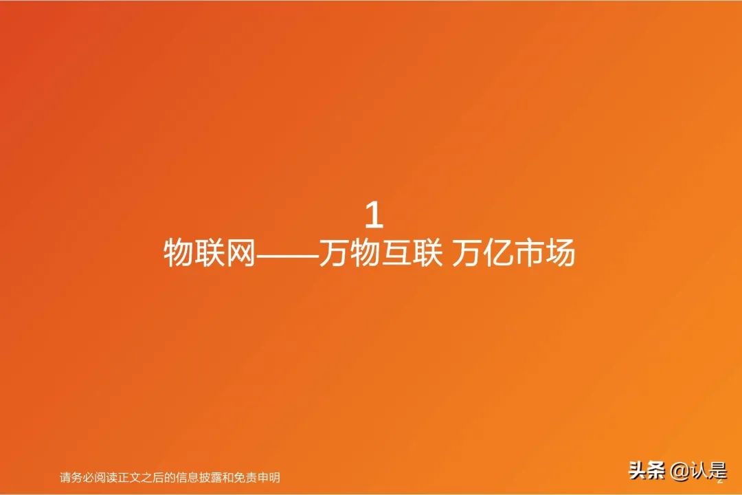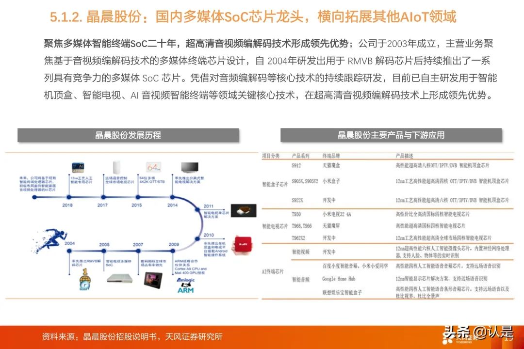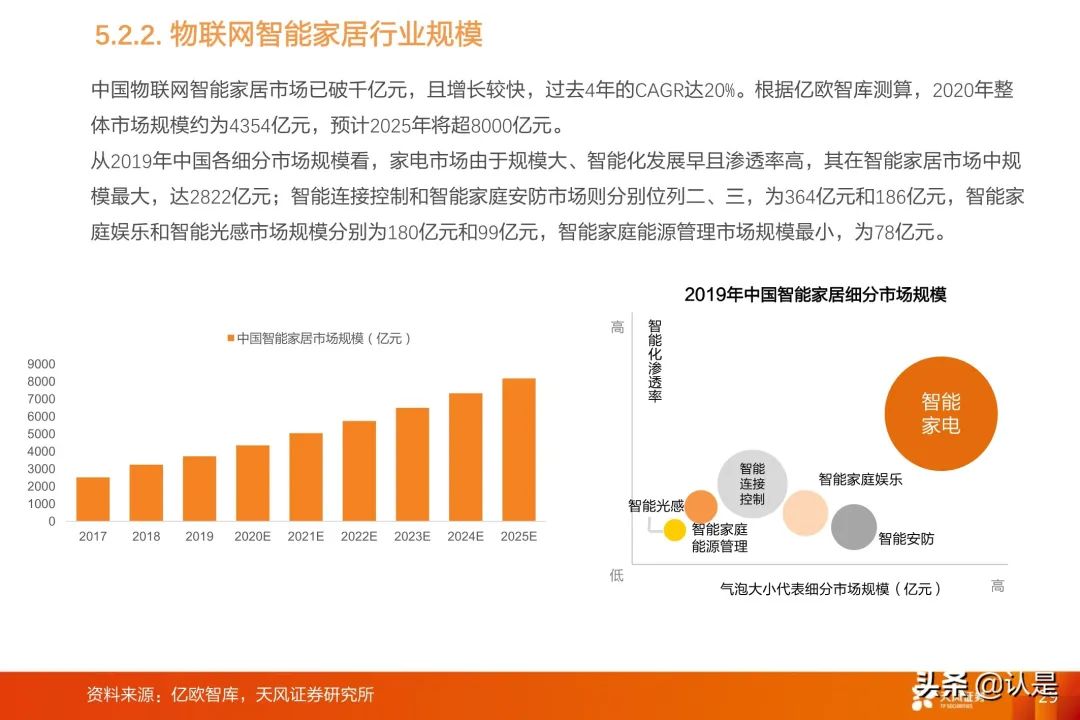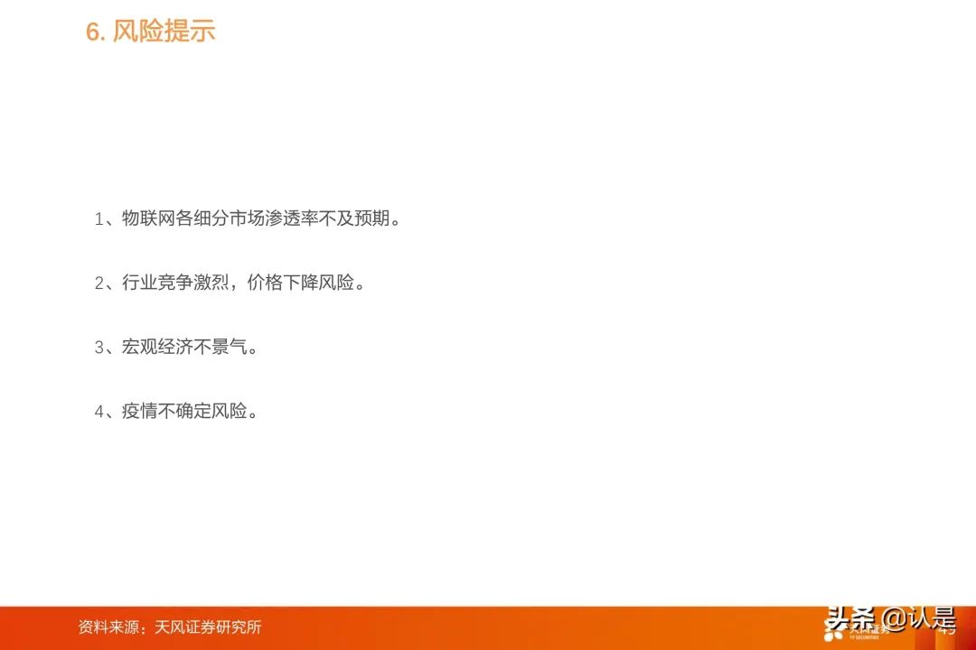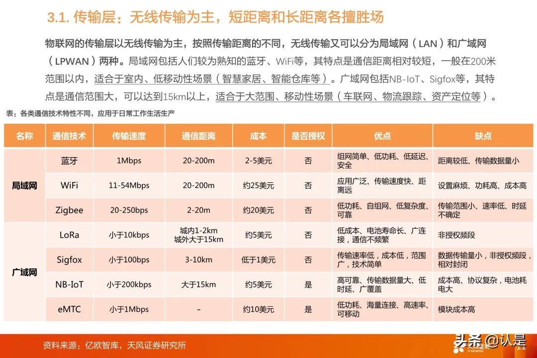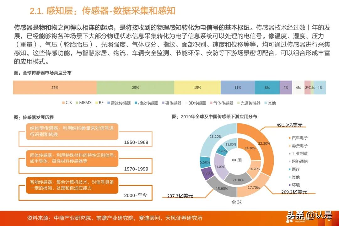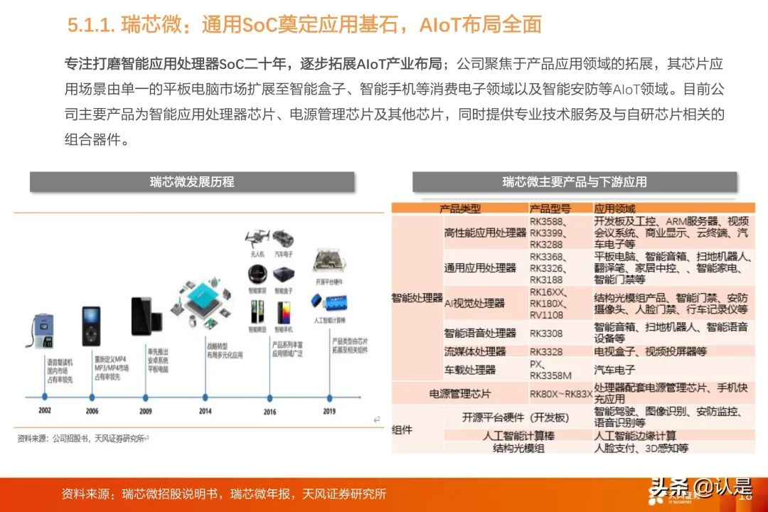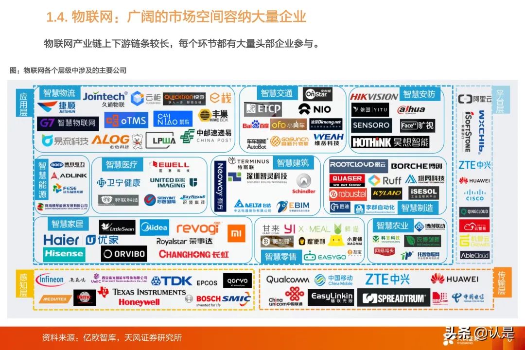1 物联网——万物互联 万亿市场物联网(IoT)是实现万物互联的核心技术,它赋予物品以感知力、控制力和决策力,推动各类生活场景 沿智能化方向不断发展。物联网的主要应用领域包括智能家居、车联网、公共服务、智慧农业、智慧物 流、智慧工业等,把过去独立割裂的终端融入网络体系,也可以创造大量新应用模式和商业模式。物联网的商业模式很多跟连接数挂钩,比如感知和传输层按传感器、网络模组出货量收费;平台层按连 接数量收费;应用层按用户规模产生经济效益等。GSMA预计到2025年,全球物联网设备连接数将达到 251亿个,全球物联网市场规模将达到1.1万亿美元。2 感知层——物理感知的枢纽传感器是物和物之间得以相连的起点,是将接收到的物理感知转化为电信号的基本枢纽。传感器技术经过数十年的发 展,已经能够将各种场景下大部分物理状态信息采集转化为电子信息系统可以处理的电信号。像温度、湿度、压力 (重量)、气压(轮胎胎压)、光照强度、气体成分、指纹、面部识别、速度和位移等等,均可通过传感器进行采集 感知。这些传感功能,与智慧家居、物流、车辆安全监测、节能环保、安防等下游场景密切配合,可以组合形成丰富 的应用模式。物联网终端功能控制和实现的核心是MCU芯片。MCU也称为单片机或微控制器,由CPU、存储器、各类 端口等构成,是智能控制的核心部件,可以简单理解成一台微型电脑。 传感器采集的信息、输入界面(按键、APP遥控等)输入的命令等经过MCU的分析和处理,再控制执行 机构(电机、变频压缩机、音频设备等),实现物联网最终的功能。3 传输层——信息传递的管道3.1. 无线传输为主,短距离和长距离各擅胜场物联网的传输层以无线传输为主,按照传输距离的不同,无线传输又可以分为局域网(LAN)和广域网 (LPWAN)两种。局域网包括人们较为熟知的蓝牙、WiFi等,其特点是通信距离相对较短,一般在200米 范围以内,适合于室内、低移动性场景(智慧家居、智能仓库等)。广域网包括NB-IoT、Sigfox等,其特 点是通信范围大,可以达到15km以上,适合于大范围、移动性场景(车联网、物流跟踪、资产定位等)。3.2. 低速率场景更多,高速率价值量较高而根据传输速率的不同,物联网业务可分为高速率、中速率及低速率业务。其中,高速率业务主要使用3G、 4G 及WiFi技术,可应用于视频监控、车载导航等场景;中速率业务主要使用蓝牙、eMTC等技术,可应用于 智能家居、储物柜等高频使用场景;低速率业务,即LPWAN(低功耗广域网),主要使用NB-IoT、LoRa、 Sigfox及ZigBee等技术,可能应用于智慧停车、远程抄表等使用频次低的应用场景。全球物联网市场有大约60%以上都属于低速率业务,这类应用需要具有支持海量连接数、低终端成本、低终 端功耗和超强覆盖等能力。由于自身的发展以及成本等问题,各个企业都在向低成本、低功耗等方向发展。而在低速率领域,中国主要以发展NB-IoT(窄带物联网)为主。3.3. 传输层的核心:物联网模组在实际产业链落地中,由于无线传输领域涉及复杂的标准专利、射频技术等,一般由专业厂商将与无线 数据传输相关的整体功能,制作成物联网模组。下游家电等厂商将物联网模组安装调试后可以快速实现 网络连接。物联网模组就是将芯片、存储器等电子器件集成于电路板上的模块化组件,是实现设备联网的基础枢纽。 依据网络制式的不同,无线模组主要可以分为4G模组、5G模组、NB-IoT模组等,依据应用场景的不同, 无线模组也可以分为智能模组和车规级模组等。4 平台层——应用实现的桥梁计费、开通、应用实现、后端数据管理等硬件端具备物联网能力后,需要平台实现整个网络和应用的具体实现。平台按功能类型大致可以分为4类, 实际上很多通用化平台兼具多个功能。1)CMP/DMP管理平台:设备连接的管理。举个例子,买一个扫地机器人,回家开机激活,与手机APP绑定 等,这些都是通过管理平台实现。2)AEP应用使能平台:很多传统公司(比如插排工厂),想升级成物联网遥控插排,但是没有相应的技术人 员,他们就可以付费使用AEP平台,AEP平台上汇聚了很多物联网解决方案,插排工厂在平台上设置产品参 数(有几个插孔)、功能模块(手机控制开关、定时开关等),就可以直接生成需要的物联网功能。3)BAP业务分析平台:物联网采集了大量用户数据,有专门的平台来分析用户数据,通过大数据让设备的 功能更加智能,也可以通过对用户习惯的分析做定制化营销等等拓展功能(比如智能门锁给老年人用,每天 都开门,突然一整天都没出门,就给家人报警是不是摔倒了等)。5 应用层——百花齐放推动产业链大发展5.1芯片铸就物联网多样下游应用5.1.1. 瑞芯微:通用SoC奠定应用基石,AIoT布局全面专注打磨智能应用处理器SoC二十年,逐步拓展AIoT产业布局;公司聚焦于产品应用领域的拓展,其芯片应 用场景由单一的平板电脑市场扩展至智能盒子、智能手机等消费电子领域以及智能安防等AIoT领域。目前公 司主要产品为智能应用处理器芯片、电源管理芯片及其他芯片,同时提供专业技术服务及与自研芯片相关的 组合器件。5.1.2. 晶晨股份:国内多媒体SoC芯片龙头,横向拓展其他AIoT领域聚焦多媒体智能终端SoC二十年,超高清音视频编解码技术形成领先优势;公司于2003年成立,主营业务聚 焦基于音视频编解码技术的多媒体终端芯片设计,自 2004年研发