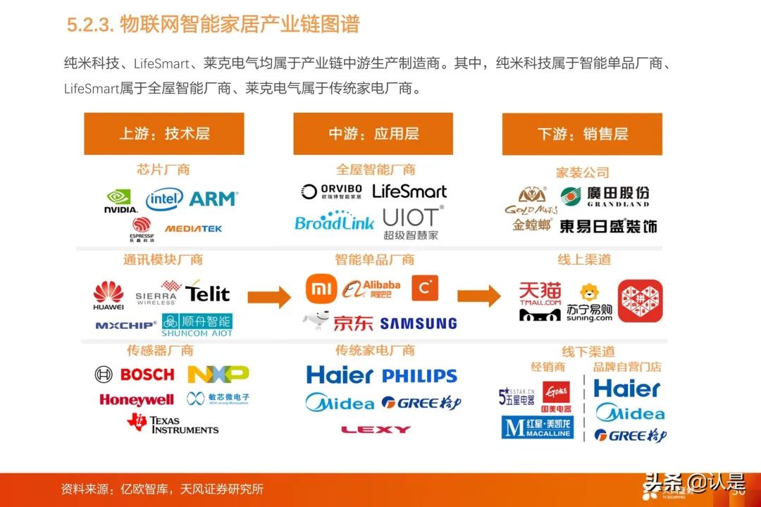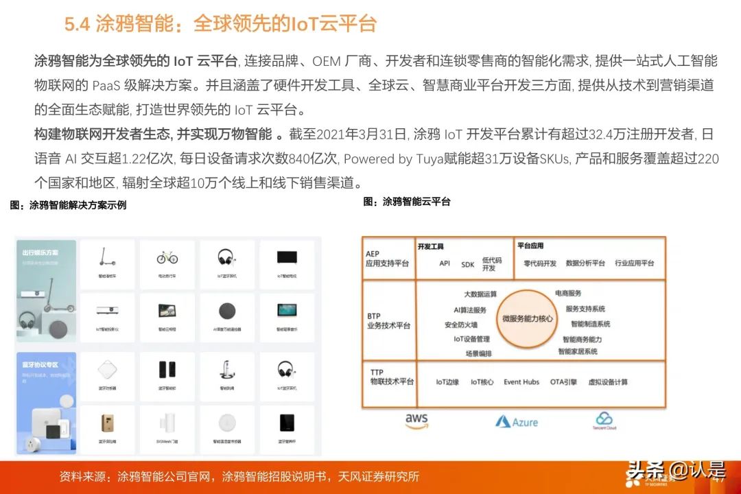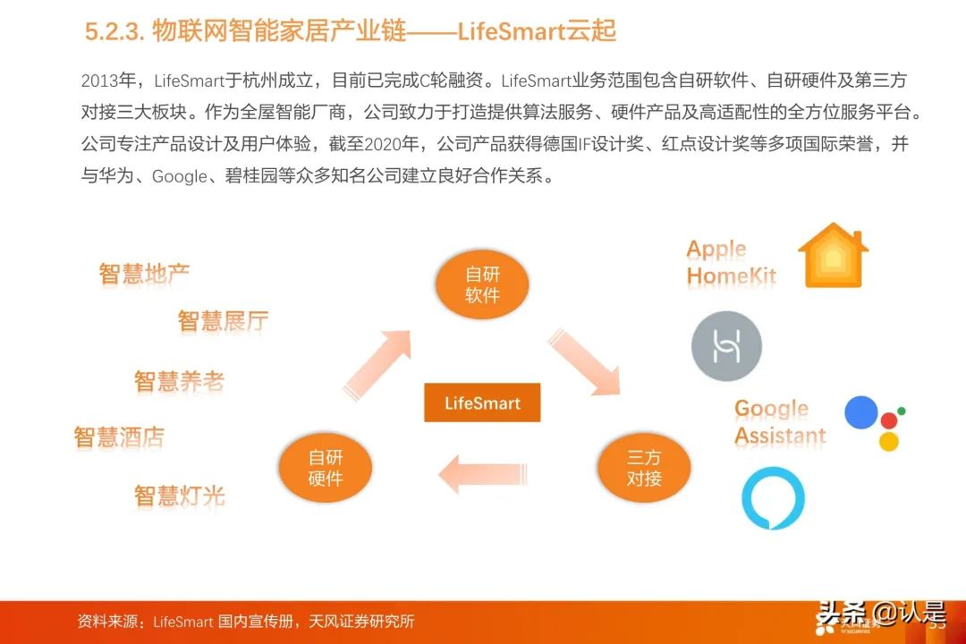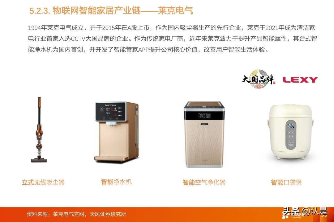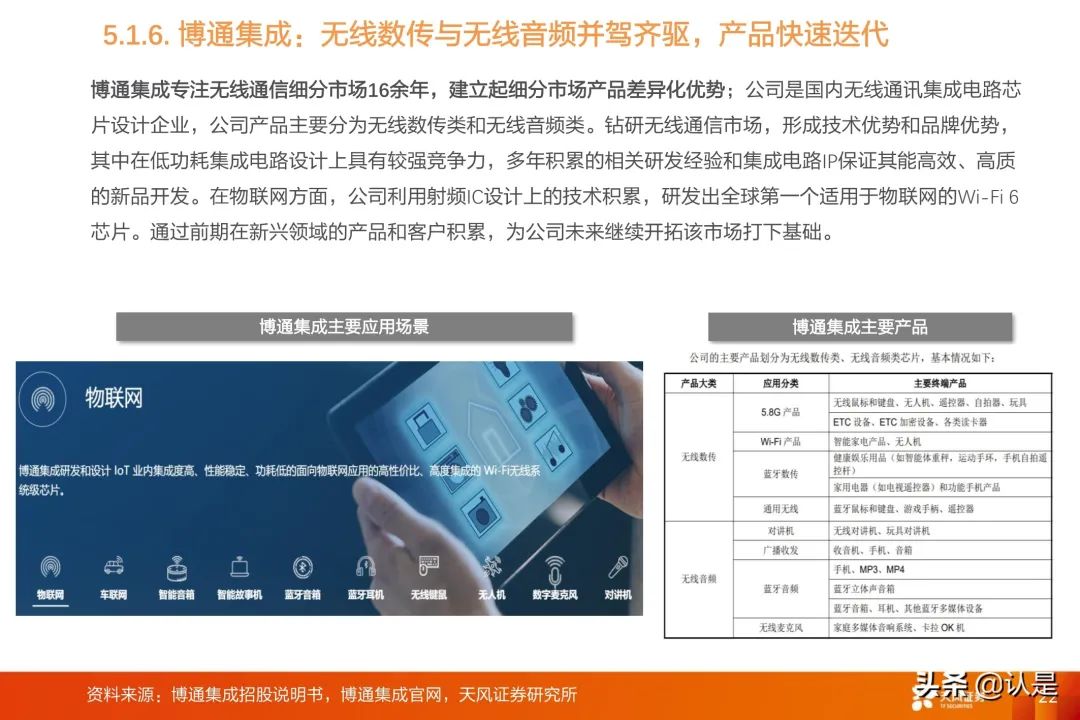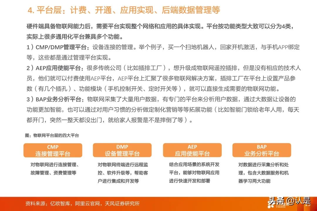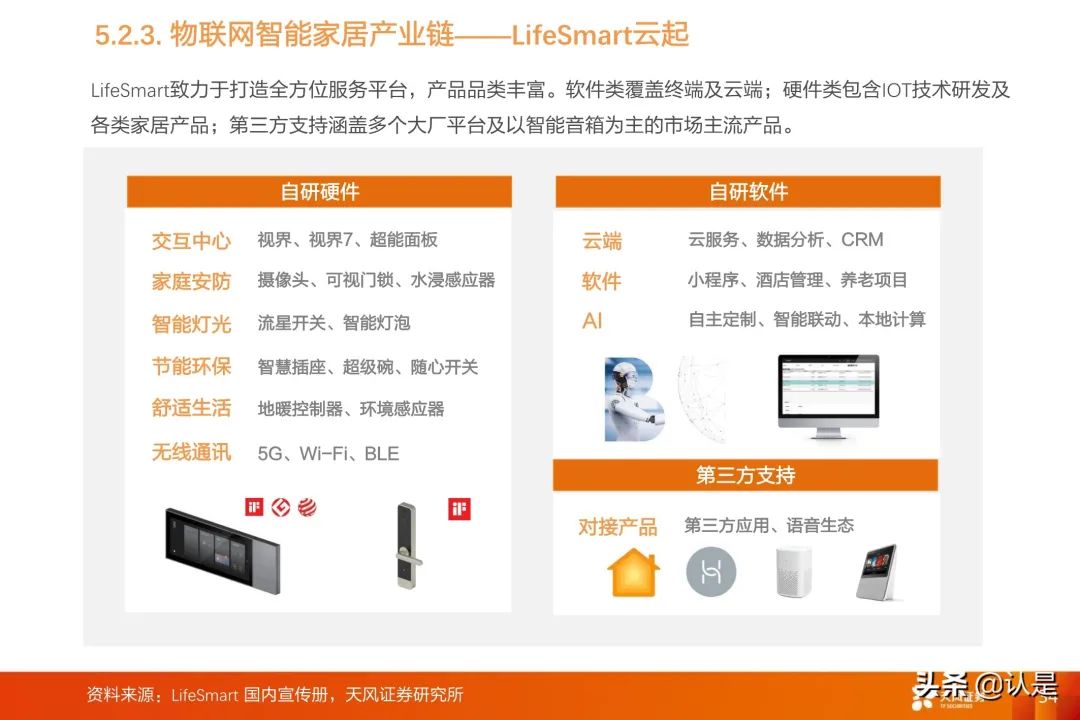 1 物联网——万物互联 万亿市场物联网(IoT)是实现万物互联的核心技术,它赋予物品以感知力、控制力和决策力,推动各类生活场景 沿智能化方向不断发展。物联网的主要应用领域包括智能家居、车联网、公共服务、智慧农业、智慧物 流、智慧工业等,把过去独立割裂的终端融入网络体系,也可以创造大量新应用模式和商业模式。物联网的商业模式很多跟连接数挂钩,比如感知和传输层按传感器、网络模组出货量收费;平台层按连 接数量收费;应用层按用户规模产生经济效益等。GSMA预计到2025年,全球物联网设备连接数将达到 251亿个,全球物联网市场规模将达到1.1万亿美元。2 感知层——物理感知的枢纽传感器是物和物之间得以相连的起点,是将接收到的物理感知转化为电信号的基本枢纽。传感器技术经过数十年的发 展,已经能够将各种场景下大部分物理状态信息采集转化为电子信息系统可以处理的电信号。像温度、湿度、压力 (重量)、气压(轮胎胎压)、光照强度、气体成分、指纹、面部识别、速度和位移等等,均可通过传感器进行采集 感知。这些传感功能,与智慧家居、物流、车辆安全监测、节能环保、安防等下游场景密切配合,可以组合形成丰富 的应用模式。物联网终端功能控制和实现的核心是MCU芯片。MCU也称为单片机或微控制器,由CPU、存储器、各类 端口等构成,是智能控制的核心部件,可以简单理解成一台微型电脑。 传感器采集的信息、输入界面(按键、APP遥控等)输入的命令等经过MCU的分析和处理,再控制执行 机构(电机、变频压缩机、音频设备等),实现物联网最终的功能。3 传输层——信息传递的管道3.1. 无线传输为主,短距离和长距离各擅胜场物联网的传输层以无线传输为主,按照传输距离的不同,无线传输又可以分为局域网(LAN)和广域网 (LPWAN)两种。局域网包括人们较为熟知的蓝牙、WiFi等,其特点是通信距离相对较短,一般在200米 范围以内,适合于室内、低移动性场景(智慧家居、智能仓库等)。广域网包括NB-IoT、Sigfox等,其特 点是通信范围大,可以达到15km以上,适合于大范围、移动性场景(车联网、物流跟踪、资产定位等)。3.2. 低速率场景更多,高速率价值量较高而根据传输速率的不同,物联网业务可分为高速率、中速率及低速率业务。其中,高速率业务主要使用3G、 4G 及WiFi技术,可应用于视频监控、车载导航等场景;中速率业务主要使用蓝牙、eMTC等技术,可应用于 智能家居、储物柜等高频使用场景;低速率业务,即LPWAN(低功耗广域网),主要使用NB-IoT、LoRa、 Sigfox及ZigBee等技术,可能应用于智慧停车、远程抄表等使用频次低的应用场景。全球物联网市场有大约60%以上都属于低速率业务,这类应用需要具有支持海量连接数、低终端成本、低终 端功耗和超强覆盖等能力。由于自身的发展以及成本等问题,各个企业都在向低成本、低功耗等方向发展。而在低速率领域,中国主要以发展NB-IoT(窄带物联网)为主。3.3. 传输层的核心:物联网模组在实际产业链落地中,由于无线传输领域涉及复杂的标准专利、射频技术等,一般由专业厂商将与无线 数据传输相关的整体功能,制作成物联网模组。下游家电等厂商将物联网模组安装调试后可以快速实现 网络连接。物联网模组就是将芯片、存储器等电子器件集成于电路板上的模块化组件,是实现设备联网的基础枢纽。 依据网络制式的不同,无线模组主要可以分为4G模组、5G模组、NB-IoT模组等,依据应用场景的不同, 无线模组也可以分为智能模组和车规级模组等。4 平台层——应用实现的桥梁计费、开通、应用实现、后端数据管理等硬件端具备物联网能力后,需要平台实现整个网络和应用的具体实现。平台按功能类型大致可以分为4类, 实际上很多通用化平台兼具多个功能。1)CMP/DMP管理平台:设备连接的管理。举个例子,买一个扫地机器人,回家开机激活,与手机APP绑定 等,这些都是通过管理平台实现。2)AEP应用使能平台:很多传统公司(比如插排工厂),想升级成物联网遥控插排,但是没有相应的技术人 员,他们就可以付费使用AEP平台,AEP平台上汇聚了很多物联网解决方案,插排工厂在平台上设置产品参 数(有几个插孔)、功能模块(手机控制开关、定时开关等),就可以直接生成需要的物联网功能。3)BAP业务分析平台:物联网采集了大量用户数据,有专门的平台来分析用户数据,通过大数据让设备的 功能更加智能,也可以通过对用户习惯的分析做定制化营销等等拓展功能(比如智能门锁给老年人用,每天 都开门,突然一整天都没出门,就给家人报警是不是摔倒了等)。5 应用层——百花齐放推动产业链大发展5.1芯片铸就物联网多样下游应用5.1.1. 瑞芯微:通用SoC奠定应用基石,AIoT布局全面专注打磨智能应用处理器SoC二十年,逐步拓展AIoT产业布局;公司聚焦于产品应用领域的拓展,其芯片应 用场景由单一的平板电脑市场扩展至智能盒子、智能手机等消费电子领域以及智能安防等AIoT领域。目前公 司主要产品为智能应用处理器芯片、电源管理芯片及其他芯片,同时提供专业技术服务及与自研芯片相关的 组合器件。5.1.2. 晶晨股份:国内多媒体SoC芯片龙头,横向拓展其他AIoT领域聚焦多媒体智能终端SoC二十年,超高清音视频编解码技术形成领先优势;公司于2003年成立,主营业务聚 焦基于音视频编解码技术的多媒体终端芯片设计,自 2004年研发