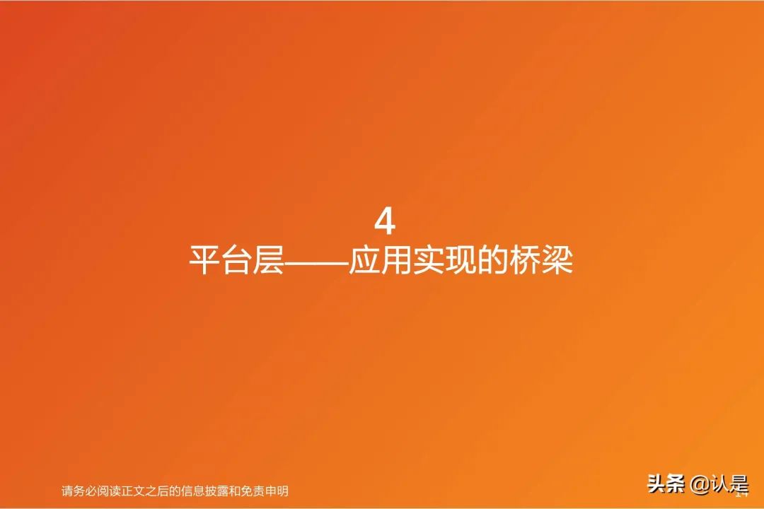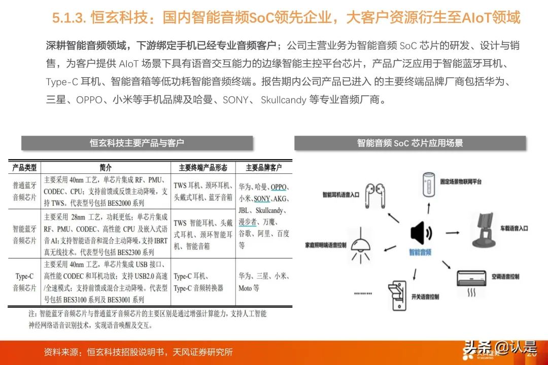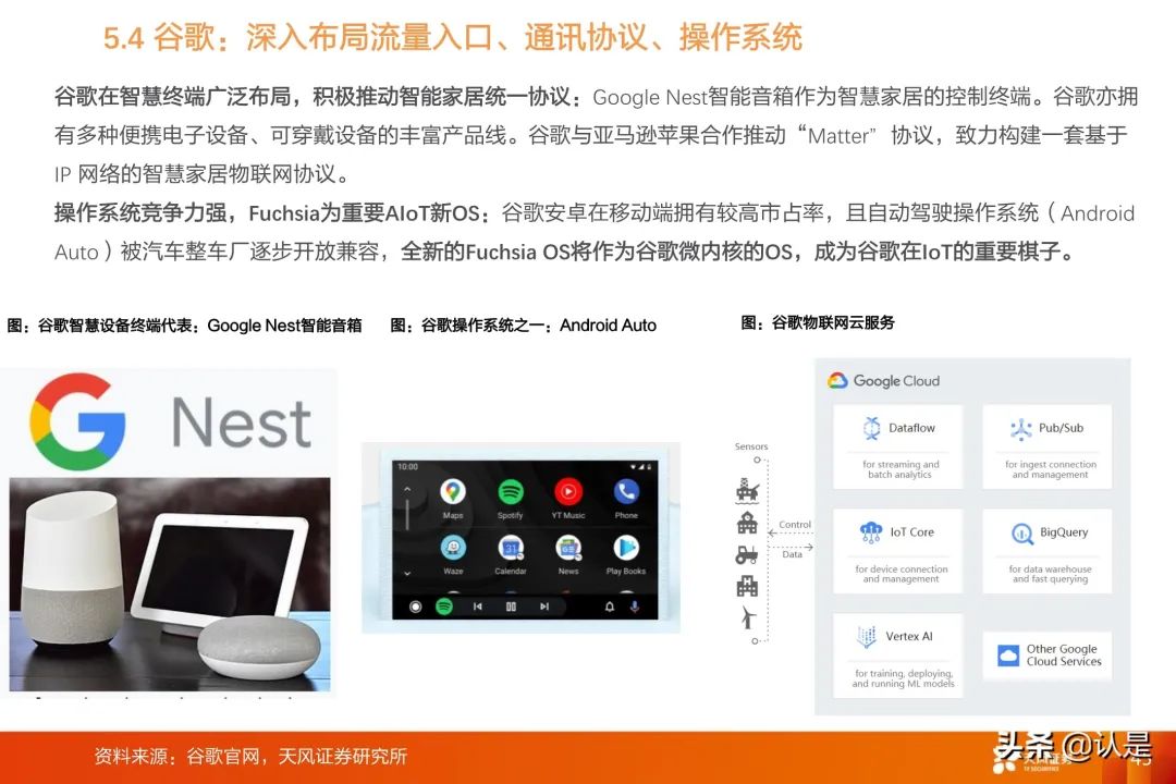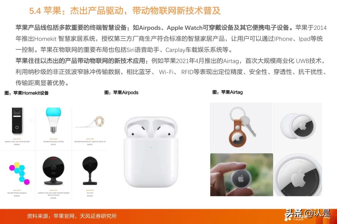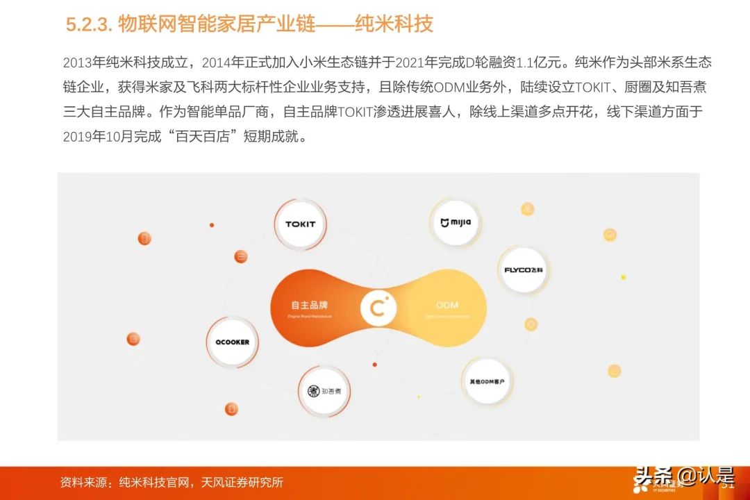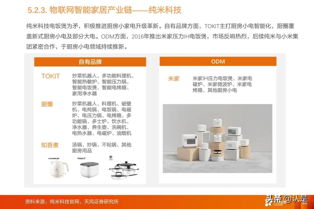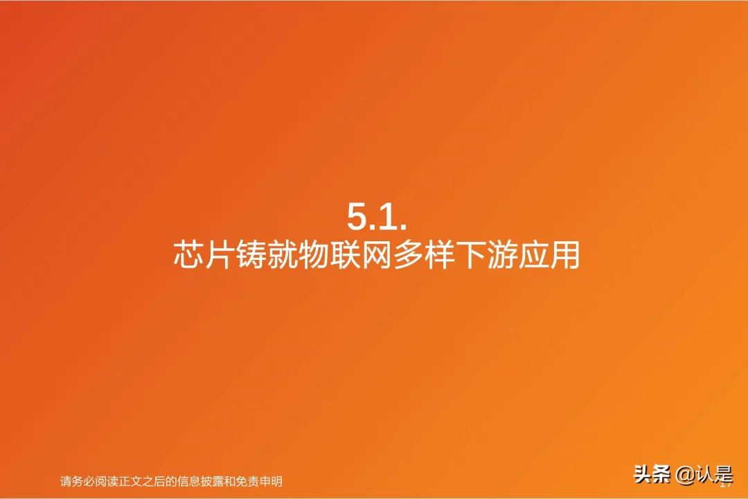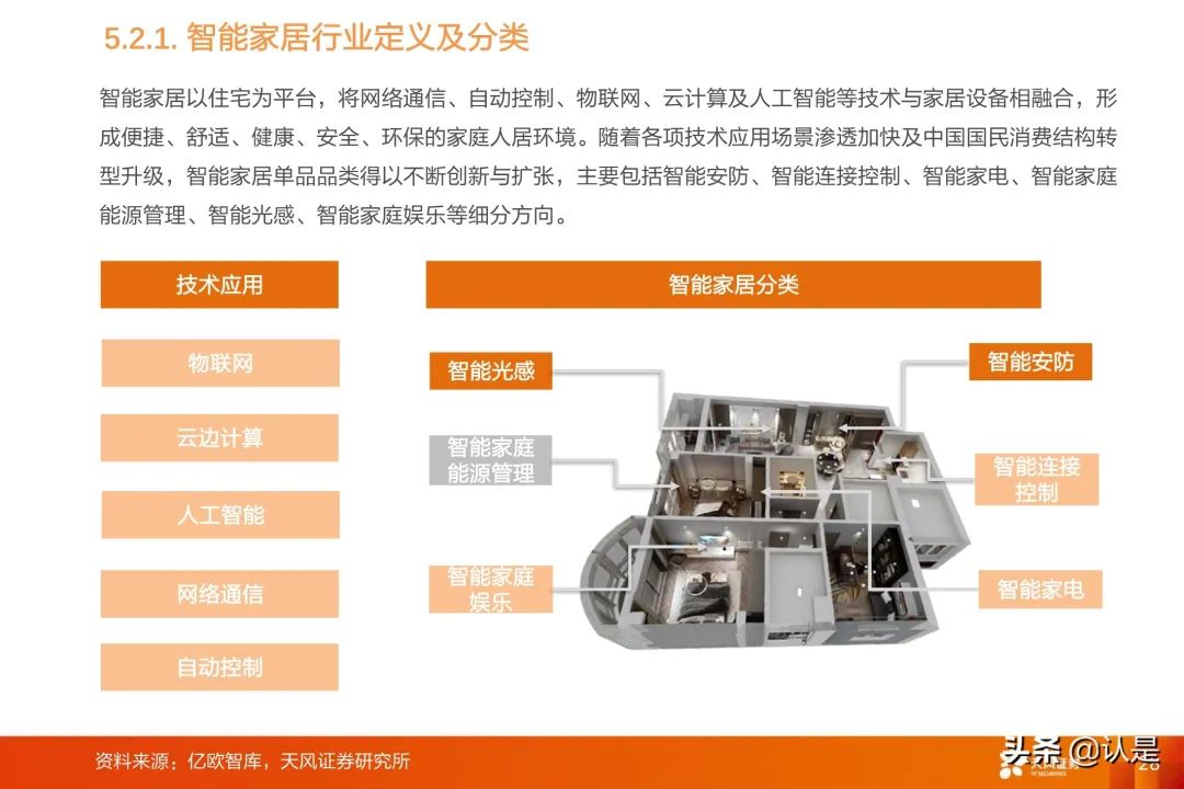 1 物联网——万物互联 万亿市场物联网(IoT)是实现万物互联的核心技术,它赋予物品以感知力、控制力和决策力,推动各类生活场景 沿智能化方向不断发展。物联网的主要应用领域包括智能家居、车联网、公共服务、智慧农业、智慧物 流、智慧工业等,把过去独立割裂的终端融入网络体系,也可以创造大量新应用模式和商业模式。物联网的商业模式很多跟连接数挂钩,比如感知和传输层按传感器、网络模组出货量收费;平台层按连 接数量收费;应用层按用户规模产生经济效益等。GSMA预计到2025年,全球物联网设备连接数将达到 251亿个,全球物联网市场规模将达到1.1万亿美元。2 感知层——物理感知的枢纽传感器是物和物之间得以相连的起点,是将接收到的物理感知转化为电信号的基本枢纽。传感器技术经过数十年的发 展,已经能够将各种场景下大部分物理状态信息采集转化为电子信息系统可以处理的电信号。像温度、湿度、压力 (重量)、气压(轮胎胎压)、光照强度、气体成分、指纹、面部识别、速度和位移等等,均可通过传感器进行采集 感知。这些传感功能,与智慧家居、物流、车辆安全监测、节能环保、安防等下游场景密切配合,可以组合形成丰富 的应用模式。物联网终端功能控制和实现的核心是MCU芯片。MCU也称为单片机或微控制器,由CPU、存储器、各类 端口等构成,是智能控制的核心部件,可以简单理解成一台微型电脑。 传感器采集的信息、输入界面(按键、APP遥控等)输入的命令等经过MCU的分析和处理,再控制执行 机构(电机、变频压缩机、音频设备等),实现物联网最终的功能。3 传输层——信息传递的管道3.1. 无线传输为主,短距离和长距离各擅胜场物联网的传输层以无线传输为主,按照传输距离的不同,无线传输又可以分为局域网(LAN)和广域网 (LPWAN)两种。局域网包括人们较为熟知的蓝牙、WiFi等,其特点是通信距离相对较短,一般在200米 范围以内,适合于室内、低移动性场景(智慧家居、智能仓库等)。广域网包括NB-IoT、Sigfox等,其特 点是通信范围大,可以达到15km以上,适合于大范围、移动性场景(车联网、物流跟踪、资产定位等)。3.2. 低速率场景更多,高速率价值量较高而根据传输速率的不同,物联网业务可分为高速率、中速率及低速率业务。其中,高速率业务主要使用3G、 4G 及WiFi技术,可应用于视频监控、车载导航等场景;中速率业务主要使用蓝牙、eMTC等技术,可应用于 智能家居、储物柜等高频使用场景;低速率业务,即LPWAN(低功耗广域网),主要使用NB-IoT、LoRa、 Sigfox及ZigBee等技术,可能应用于智慧停车、远程抄表等使用频次低的应用场景。全球物联网市场有大约60%以上都属于低速率业务,这类应用需要具有支持海量连接数、低终端成本、低终 端功耗和超强覆盖等能力。由于自身的发展以及成本等问题,各个企业都在向低成本、低功耗等方向发展。而在低速率领域,中国主要以发展NB-IoT(窄带物联网)为主。3.3. 传输层的核心:物联网模组在实际产业链落地中,由于无线传输领域涉及复杂的标准专利、射频技术等,一般由专业厂商将与无线 数据传输相关的整体功能,制作成物联网模组。下游家电等厂商将物联网模组安装调试后可以快速实现 网络连接。物联网模组就是将芯片、存储器等电子器件集成于电路板上的模块化组件,是实现设备联网的基础枢纽。 依据网络制式的不同,无线模组主要可以分为4G模组、5G模组、NB-IoT模组等,依据应用场景的不同, 无线模组也可以分为智能模组和车规级模组等。4 平台层——应用实现的桥梁计费、开通、应用实现、后端数据管理等硬件端具备物联网能力后,需要平台实现整个网络和应用的具体实现。平台按功能类型大致可以分为4类, 实际上很多通用化平台兼具多个功能。1)CMP/DMP管理平台:设备连接的管理。举个例子,买一个扫地机器人,回家开机激活,与手机APP绑定 等,这些都是通过管理平台实现。2)AEP应用使能平台:很多传统公司(比如插排工厂),想升级成物联网遥控插排,但是没有相应的技术人 员,他们就可以付费使用AEP平台,AEP平台上汇聚了很多物联网解决方案,插排工厂在平台上设置产品参 数(有几个插孔)、功能模块(手机控制开关、定时开关等),就可以直接生成需要的物联网功能。3)BAP业务分析平台:物联网采集了大量用户数据,有专门的平台来分析用户数据,通过大数据让设备的 功能更加智能,也可以通过对用户习惯的分析做定制化营销等等拓展功能(比如智能门锁给老年人用,每天 都开门,突然一整天都没出门,就给家人报警是不是摔倒了等)。5 应用层——百花齐放推动产业链大发展5.1芯片铸就物联网多样下游应用5.1.1. 瑞芯微:通用SoC奠定应用基石,AIoT布局全面专注打磨智能应用处理器SoC二十年,逐步拓展AIoT产业布局;公司聚焦于产品应用领域的拓展,其芯片应 用场景由单一的平板电脑市场扩展至智能盒子、智能手机等消费电子领域以及智能安防等AIoT领域。目前公 司主要产品为智能应用处理器芯片、电源管理芯片及其他芯片,同时提供专业技术服务及与自研芯片相关的 组合器件。5.1.2. 晶晨股份:国内多媒体SoC芯片龙头,横向拓展其他AIoT领域聚焦多媒体智能终端SoC二十年,超高清音视频编解码技术形成领先优势;公司于2003年成立,主营业务聚 焦基于音视频编解码技术的多媒体终端芯片设计,自 2004年研发