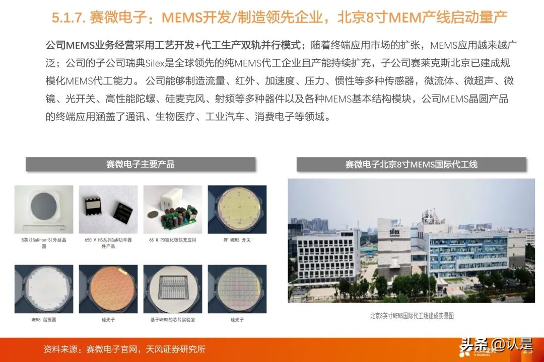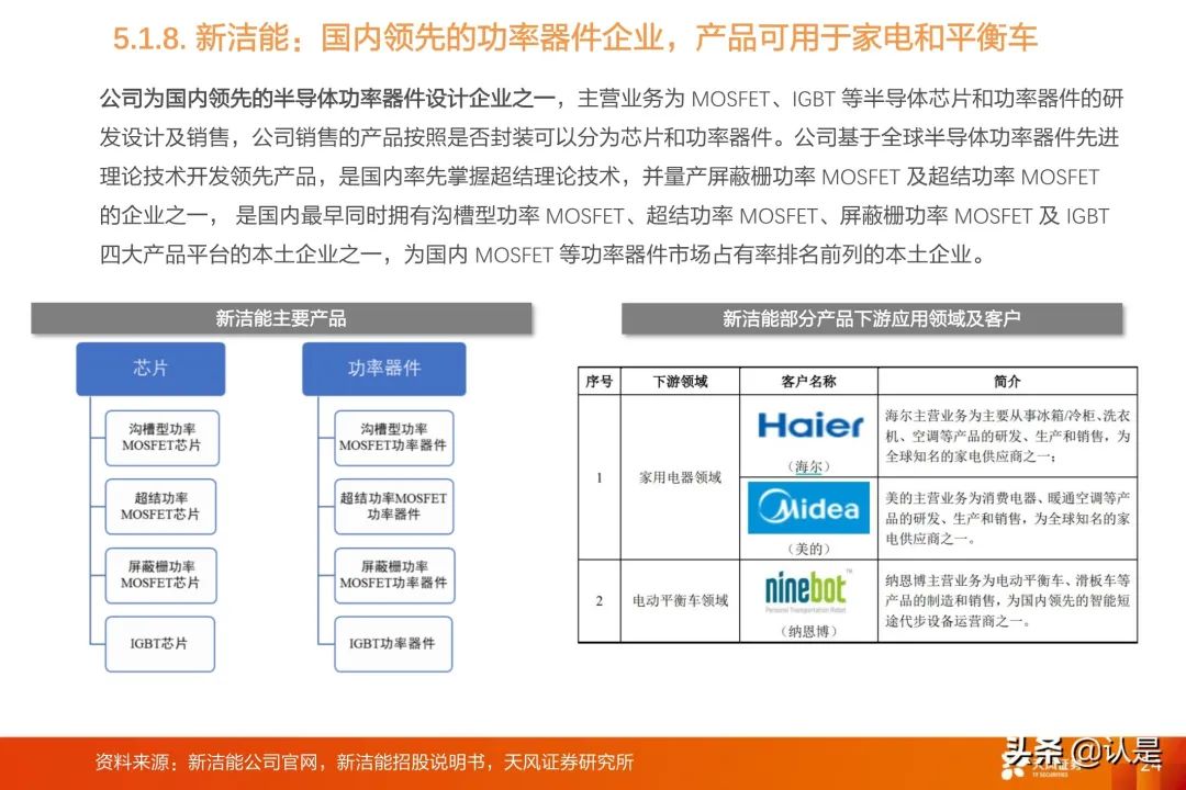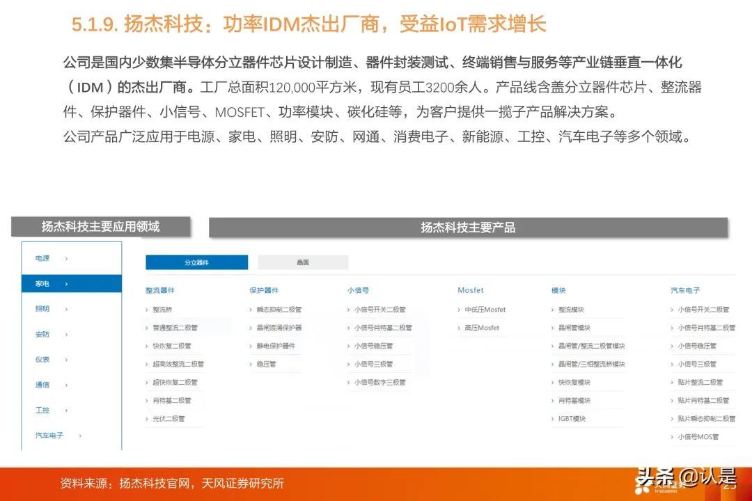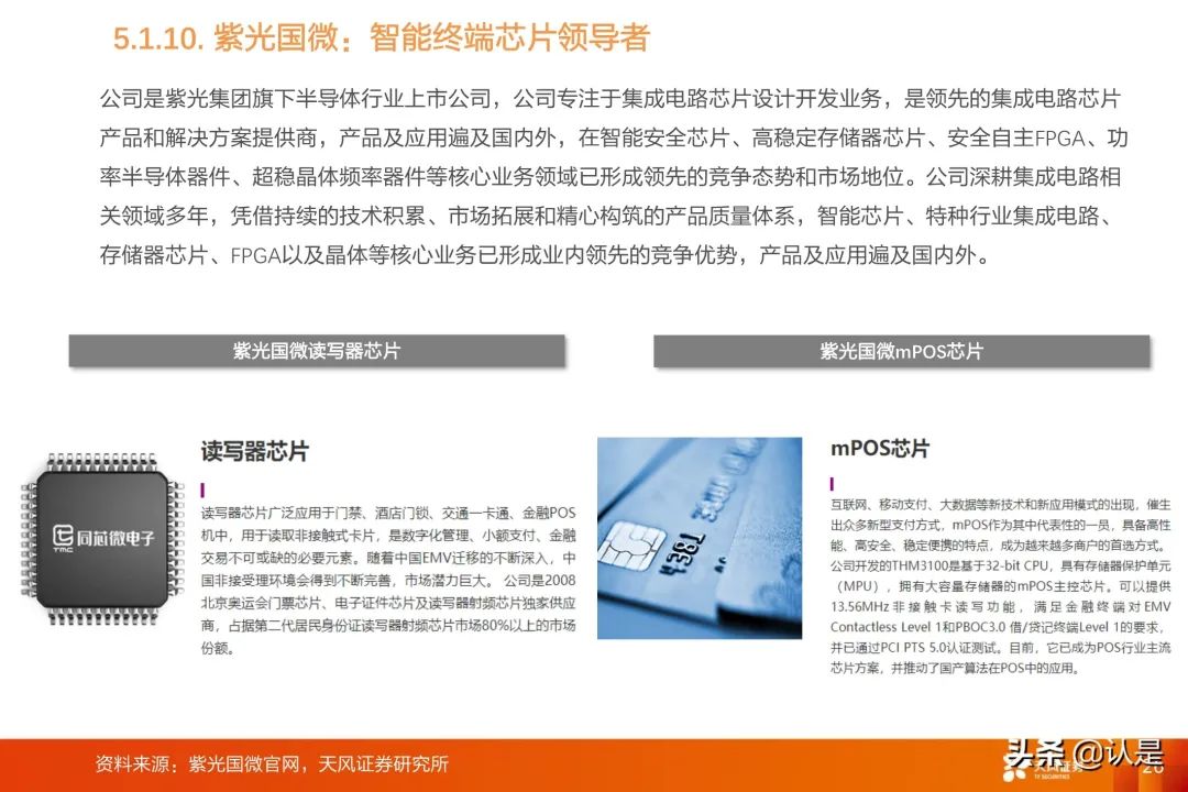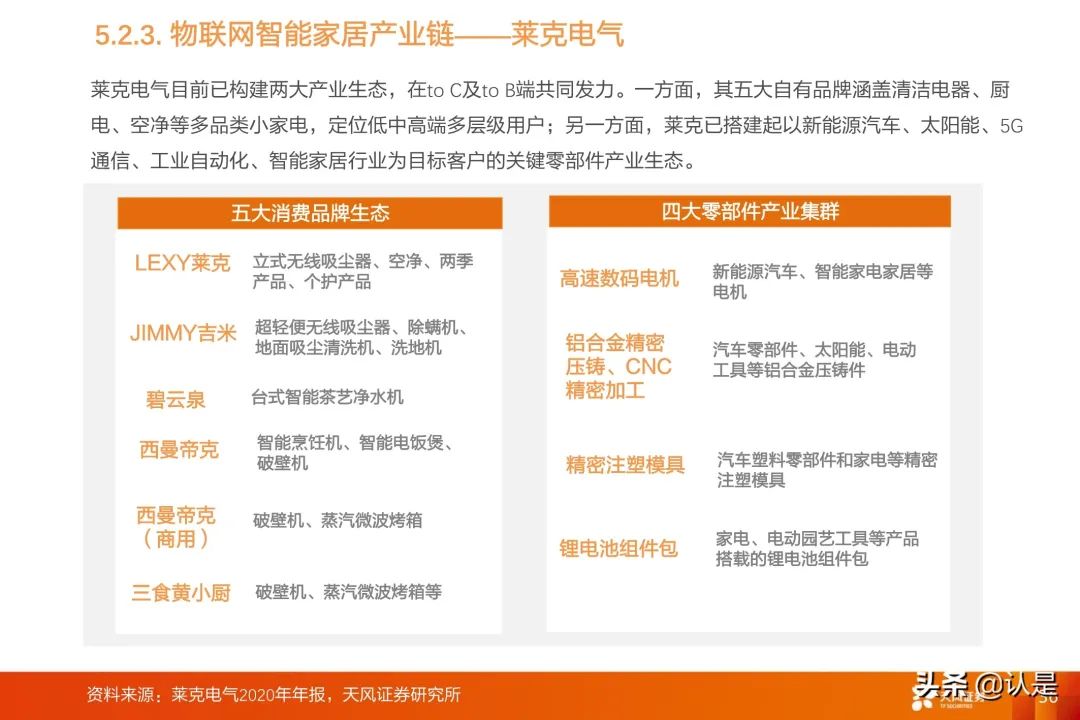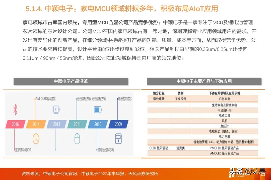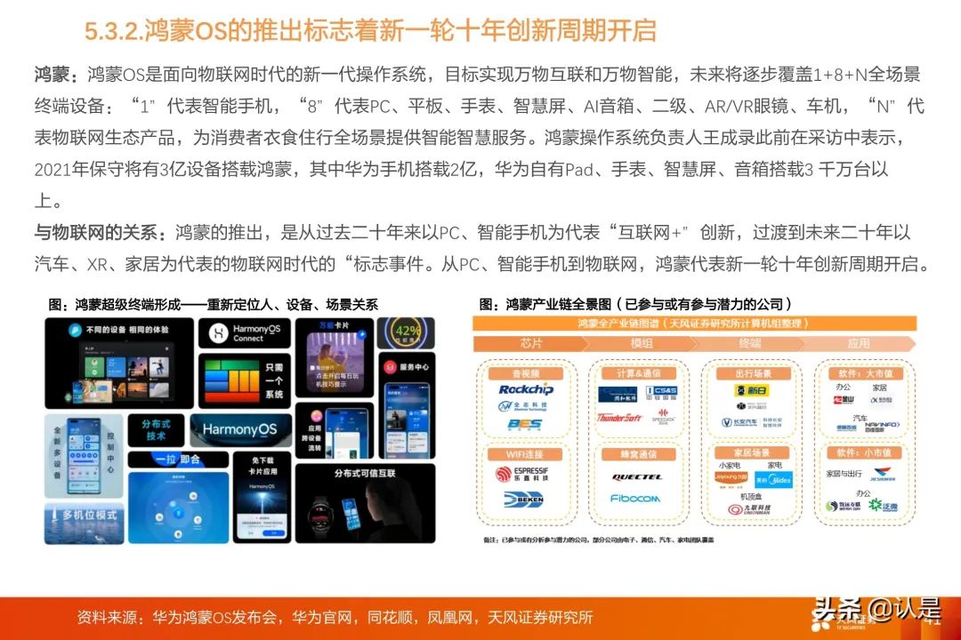 1 物联网——万物互联 万亿市场物联网(IoT)是实现万物互联的核心技术,它赋予物品以感知力、控制力和决策力,推动各类生活场景 沿智能化方向不断发展。物联网的主要应用领域包括智能家居、车联网、公共服务、智慧农业、智慧物 流、智慧工业等,把过去独立割裂的终端融入网络体系,也可以创造大量新应用模式和商业模式。物联网的商业模式很多跟连接数挂钩,比如感知和传输层按传感器、网络模组出货量收费;平台层按连 接数量收费;应用层按用户规模产生经济效益等。GSMA预计到2025年,全球物联网设备连接数将达到 251亿个,全球物联网市场规模将达到1.1万亿美元。2 感知层——物理感知的枢纽传感器是物和物之间得以相连的起点,是将接收到的物理感知转化为电信号的基本枢纽。传感器技术经过数十年的发 展,已经能够将各种场景下大部分物理状态信息采集转化为电子信息系统可以处理的电信号。像温度、湿度、压力 (重量)、气压(轮胎胎压)、光照强度、气体成分、指纹、面部识别、速度和位移等等,均可通过传感器进行采集 感知。这些传感功能,与智慧家居、物流、车辆安全监测、节能环保、安防等下游场景密切配合,可以组合形成丰富 的应用模式。物联网终端功能控制和实现的核心是MCU芯片。MCU也称为单片机或微控制器,由CPU、存储器、各类 端口等构成,是智能控制的核心部件,可以简单理解成一台微型电脑。 传感器采集的信息、输入界面(按键、APP遥控等)输入的命令等经过MCU的分析和处理,再控制执行 机构(电机、变频压缩机、音频设备等),实现物联网最终的功能。3 传输层——信息传递的管道3.1. 无线传输为主,短距离和长距离各擅胜场物联网的传输层以无线传输为主,按照传输距离的不同,无线传输又可以分为局域网(LAN)和广域网 (LPWAN)两种。局域网包括人们较为熟知的蓝牙、WiFi等,其特点是通信距离相对较短,一般在200米 范围以内,适合于室内、低移动性场景(智慧家居、智能仓库等)。广域网包括NB-IoT、Sigfox等,其特 点是通信范围大,可以达到15km以上,适合于大范围、移动性场景(车联网、物流跟踪、资产定位等)。3.2. 低速率场景更多,高速率价值量较高而根据传输速率的不同,物联网业务可分为高速率、中速率及低速率业务。其中,高速率业务主要使用3G、 4G 及WiFi技术,可应用于视频监控、车载导航等场景;中速率业务主要使用蓝牙、eMTC等技术,可应用于 智能家居、储物柜等高频使用场景;低速率业务,即LPWAN(低功耗广域网),主要使用NB-IoT、LoRa、 Sigfox及ZigBee等技术,可能应用于智慧停车、远程抄表等使用频次低的应用场景。全球物联网市场有大约60%以上都属于低速率业务,这类应用需要具有支持海量连接数、低终端成本、低终 端功耗和超强覆盖等能力。由于自身的发展以及成本等问题,各个企业都在向低成本、低功耗等方向发展。而在低速率领域,中国主要以发展NB-IoT(窄带物联网)为主。3.3. 传输层的核心:物联网模组在实际产业链落地中,由于无线传输领域涉及复杂的标准专利、射频技术等,一般由专业厂商将与无线 数据传输相关的整体功能,制作成物联网模组。下游家电等厂商将物联网模组安装调试后可以快速实现 网络连接。物联网模组就是将芯片、存储器等电子器件集成于电路板上的模块化组件,是实现设备联网的基础枢纽。 依据网络制式的不同,无线模组主要可以分为4G模组、5G模组、NB-IoT模组等,依据应用场景的不同, 无线模组也可以分为智能模组和车规级模组等。4 平台层——应用实现的桥梁计费、开通、应用实现、后端数据管理等硬件端具备物联网能力后,需要平台实现整个网络和应用的具体实现。平台按功能类型大致可以分为4类, 实际上很多通用化平台兼具多个功能。1)CMP/DMP管理平台:设备连接的管理。举个例子,买一个扫地机器人,回家开机激活,与手机APP绑定 等,这些都是通过管理平台实现。2)AEP应用使能平台:很多传统公司(比如插排工厂),想升级成物联网遥控插排,但是没有相应的技术人 员,他们就可以付费使用AEP平台,AEP平台上汇聚了很多物联网解决方案,插排工厂在平台上设置产品参 数(有几个插孔)、功能模块(手机控制开关、定时开关等),就可以直接生成需要的物联网功能。3)BAP业务分析平台:物联网采集了大量用户数据,有专门的平台来分析用户数据,通过大数据让设备的 功能更加智能,也可以通过对用户习惯的分析做定制化营销等等拓展功能(比如智能门锁给老年人用,每天 都开门,突然一整天都没出门,就给家人报警是不是摔倒了等)。5 应用层——百花齐放推动产业链大发展5.1芯片铸就物联网多样下游应用5.1.1. 瑞芯微:通用SoC奠定应用基石,AIoT布局全面专注打磨智能应用处理器SoC二十年,逐步拓展AIoT产业布局;公司聚焦于产品应用领域的拓展,其芯片应 用场景由单一的平板电脑市场扩展至智能盒子、智能手机等消费电子领域以及智能安防等AIoT领域。目前公 司主要产品为智能应用处理器芯片、电源管理芯片及其他芯片,同时提供专业技术服务及与自研芯片相关的 组合器件。5.1.2. 晶晨股份:国内多媒体SoC芯片龙头,横向拓展其他AIoT领域聚焦多媒体智能终端SoC二十年,超高清音视频编解码技术形成领先优势;公司于2003年成立,主营业务聚 焦基于音视频编解码技术的多媒体终端芯片设计,自 2004年研发