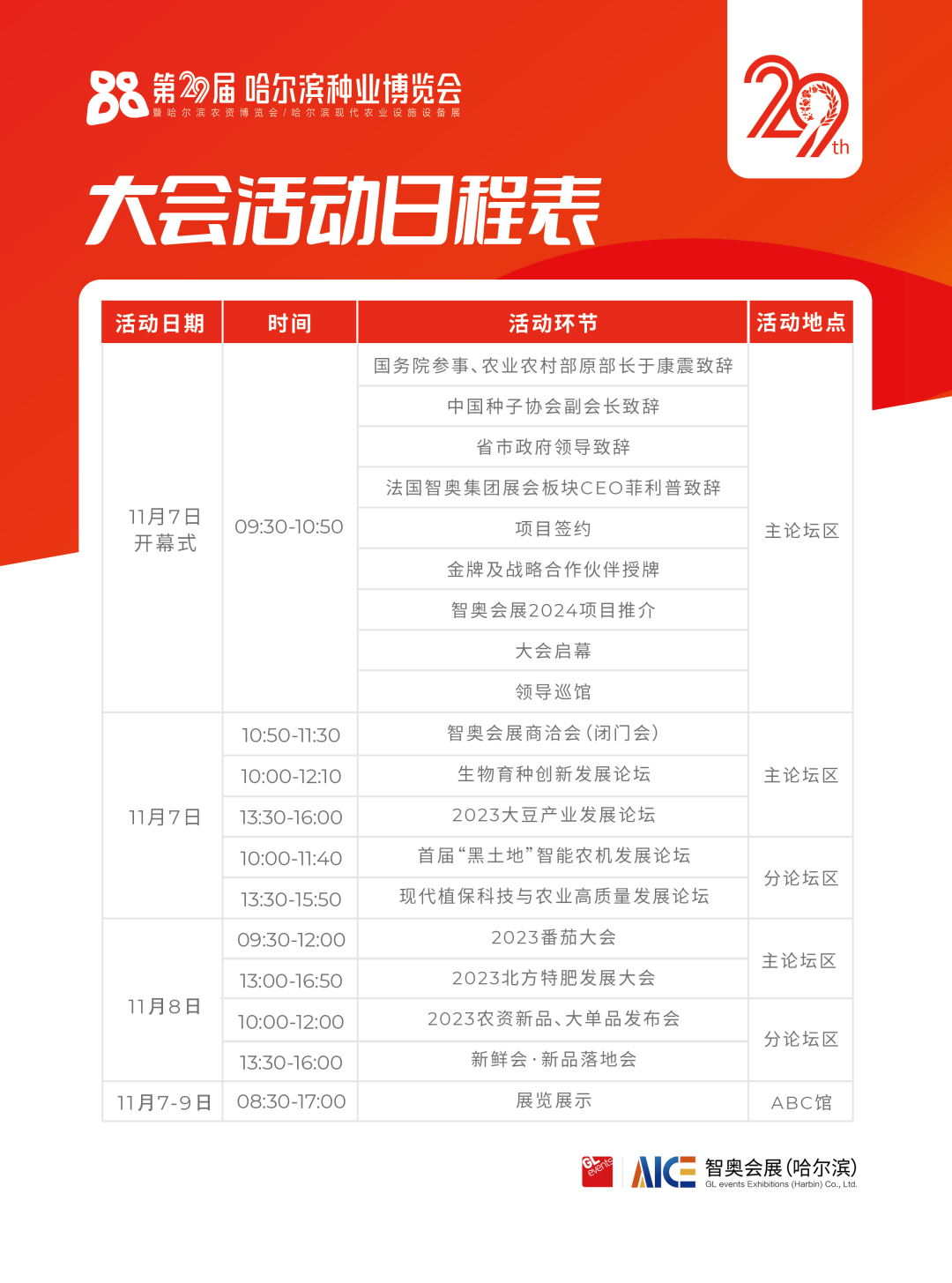 第29届哈尔滨种业博览会(HSIE)将于11月7日-9日将在哈尔滨国际会展中心隆重启幕!同期还将举办哈尔滨农资博览会,哈尔滨现代农业设施设备展,将有1300+品牌企业展出万余款产品。