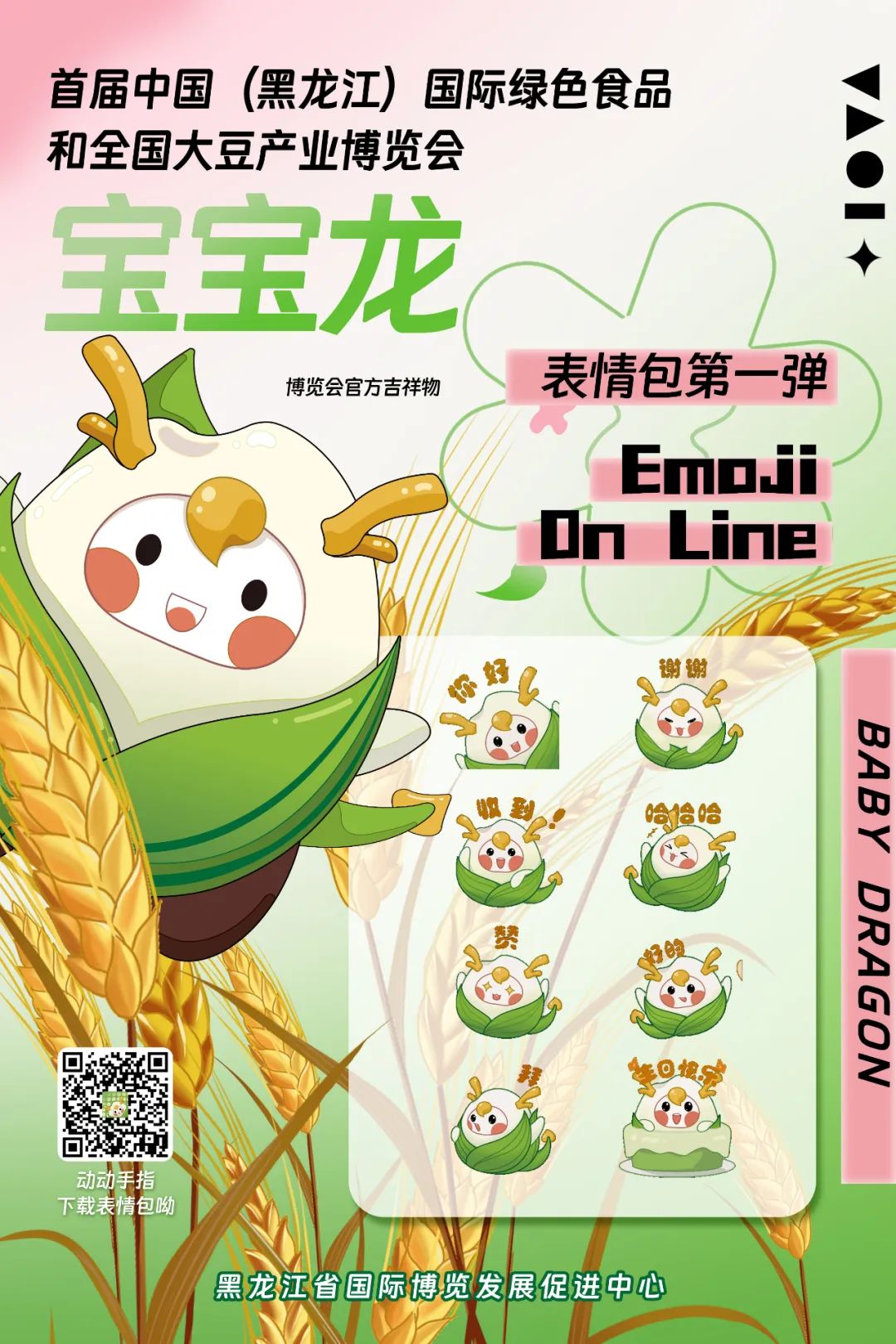 首届中国(黑龙江)国际绿色食品和全国大豆产业博览会(简称博览会)将于2023年11月14-18日在哈尔滨国际会展中心举办。今天,博览会吉祥物“宝宝龙”表情包正式上线啦,快来动动手指下载吧!