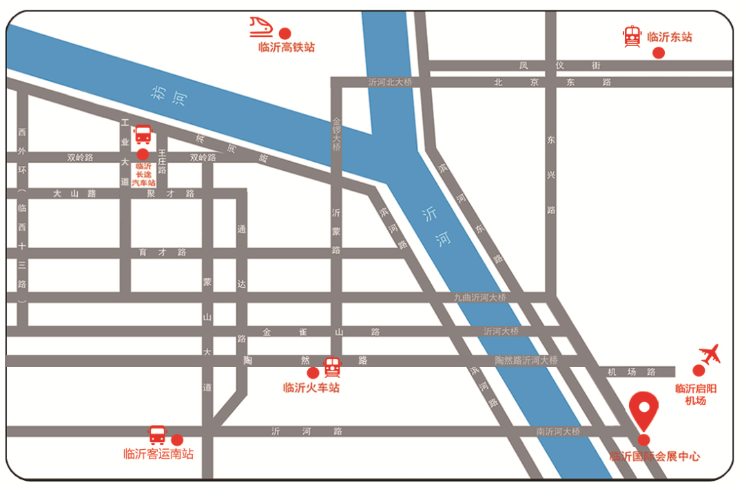 公交:K81路→临沂运输枢纽信息中心→公交K33路→东方城站→步行400米到达临沂国际会展中心。